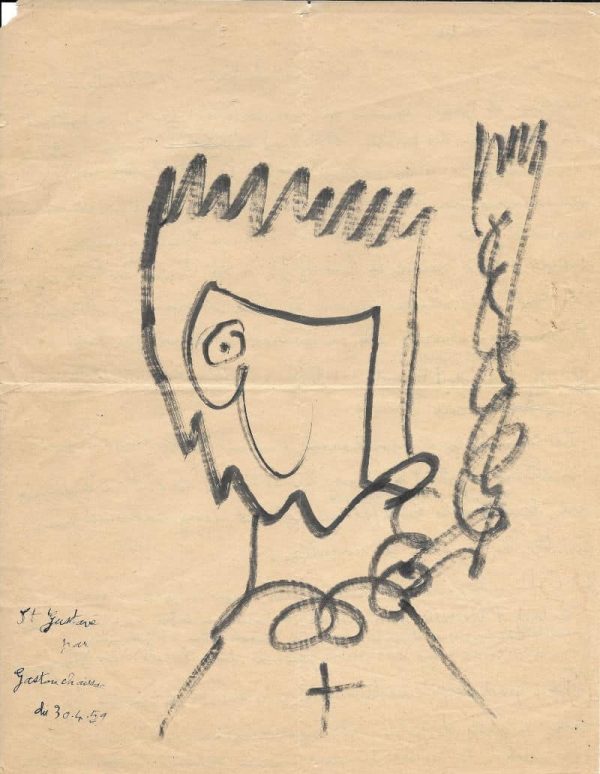 Dessin représentant Saint Gustave à l’encre de chine sur papier insolé, 27 x 21cm, titré, daté et signé en bas à gauche.