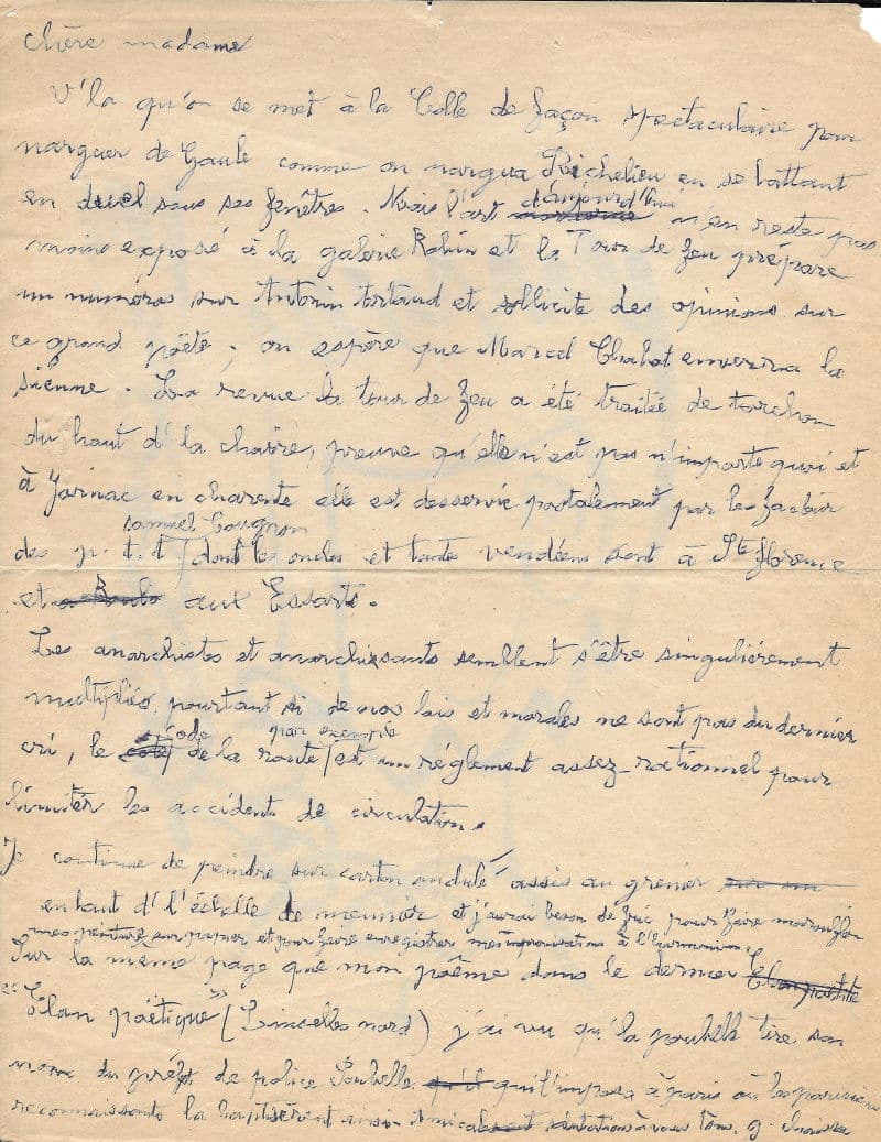 Chaissac donne de ses nouvelles et commente l’actualité : « Chère madame, V’la qu’on se met à la Colle de façon spectaculaire pour narguer de Gaulle comme on nargua Richelieu en se battant en duel sous ses fenêtres. Mais l’art d’aujourd’hui n’en reste pas moins exposé à la galerie Robin et la Tour de feu prépare un numéro sur Antonin Artaud et sollicite des opinions sur ce grand poête ; on espère que Marcel Charlot enverra la sienne. La revue la terre de feu a été traitée de torchon du haut d’la chaire preuve qu’elle n’est pas n’importe quoi et à Jarnac en Charente elle est desservie postalement par le facteur des p.t.t dont les oncles et tantes vendéens sont à Ste Florence et aux Essarts. Les anarchisants semblent s’être singulièrement multipliés pourtant si de nos lois et morales ne sont pas du dernier cri, le code de la route par exemple est un règlement assez rationnel pour limiter les accidents de circulation. Je continue de peindre sur carton ondulé assis au grenier en haut d’l’échelle de meunier et j’aurai besoin de fric pour’faire maroufler mes peintures sur papier et pour faire enregistrer mes improvisations à l’harmonium. Sur la même page que mon poême dans le dernier Elan poétique (Linselles nord) j’ai vu qu’la poubelle tire son nom du préfet de police Poubelle qui l’imposa à Paris où les parisiens reconnaissants la baptisèrent ainsi amicalement. Salutations à vous tous. G. Chaissac »