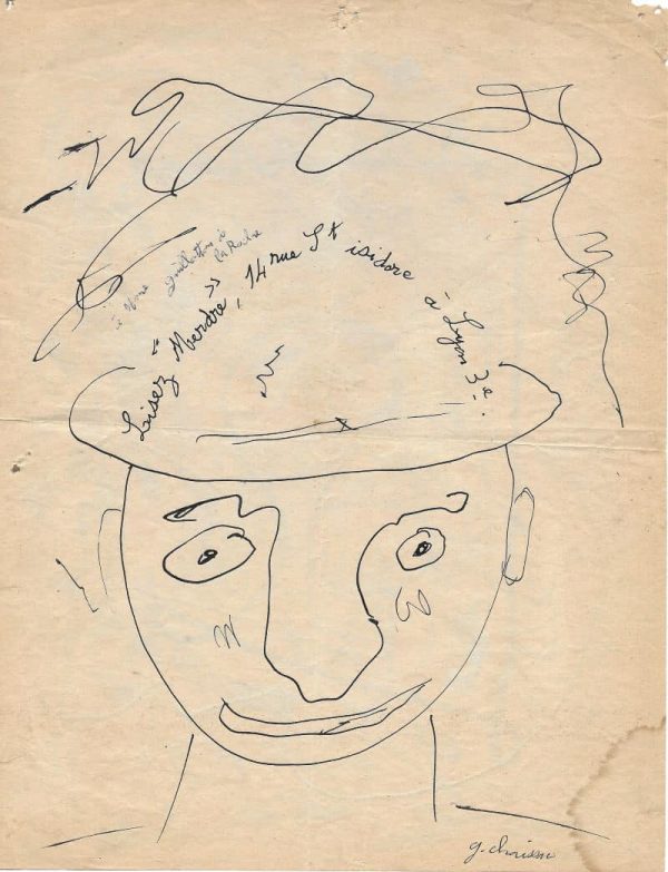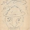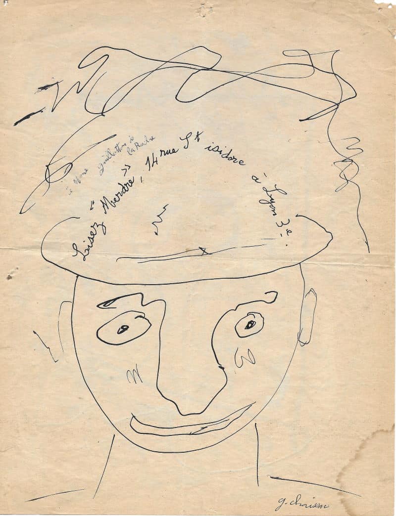 Sur la deuxième face, dessin d’un portrait d’homme au chapeau à l’encre bleue sur papier teinté. Annoté et signé en bas à droite.