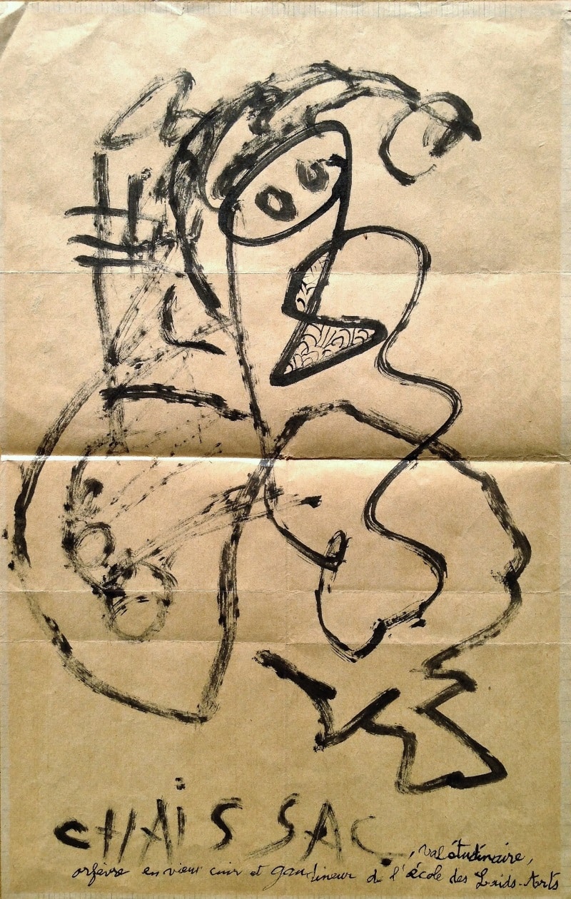 Dessin d’un personnage à l’encre de chine sur une feuille de cahier d’écolier, signé et titré « Valétudinaire, orfèvre en vieux cuir et gandineur de l’école des Laids-Arts »