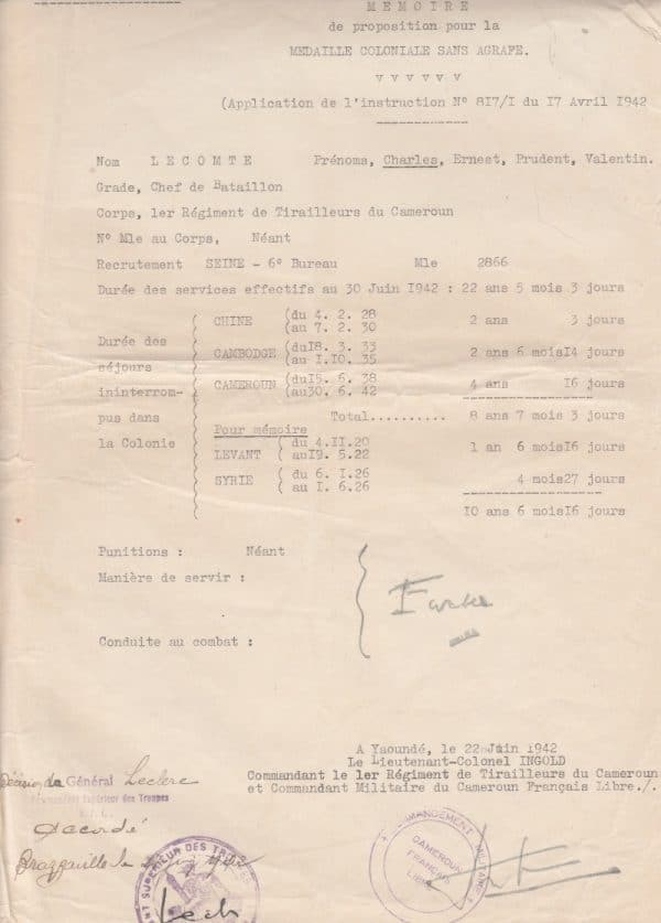Le général Leclerc accorde la médaille coloniale à un dénommé Charles Lecomte, chef de bataillon du 1er régiment de tirailleurs du Cameroun, pour ses états de services : Chine, Cambodge, Cameroun, Levant et Syrie, il n’a été relevé aucune punition.