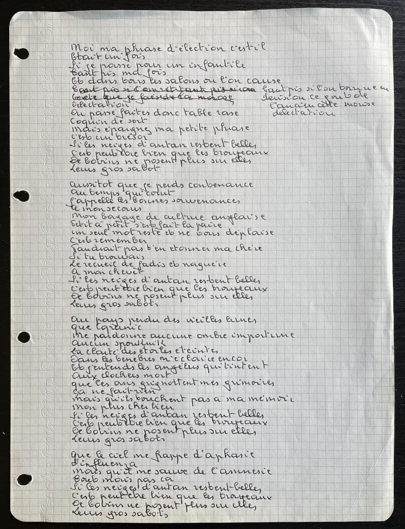 Manuscrit retrouvé d’une des dernières chansons que Brassens n’a pas eu le temps d’enregistrer avant sa mort, survenue le 29 octobre 1981. La chanson « Le passéiste » fut mise en musique par Brassens et interprétée en 1982 par Jean Bertola.