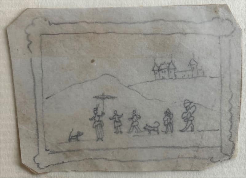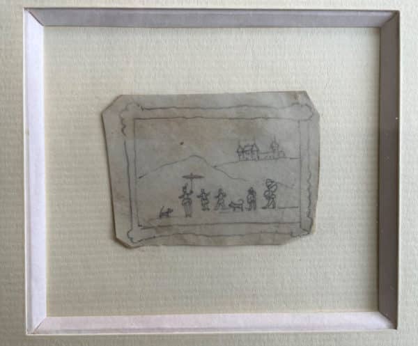 Une pièce à part, mine de plomb sur papier, 3,3 x 4,4 cm. Scène de promenade à Nohant, représentant Georges Sand sous une ombrelle, ses deux petites-filles, Aurore et Gabrielle, deux chiens et deux personnages, dont un Polichinelle, avec un château en arrière-plan.