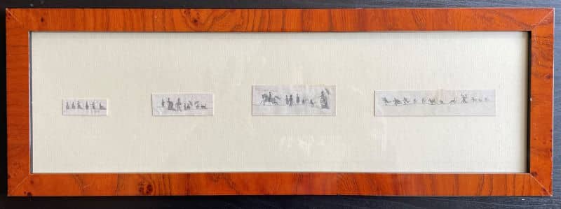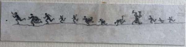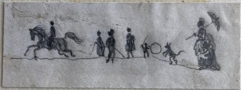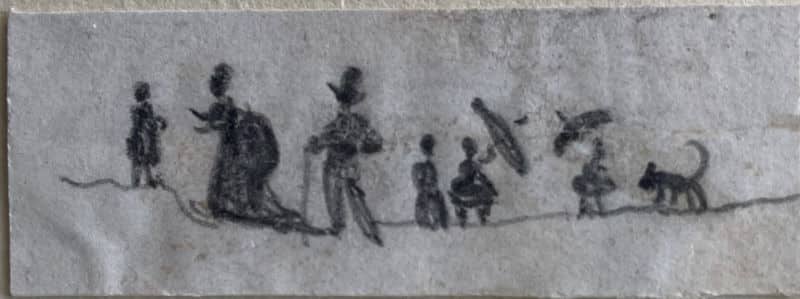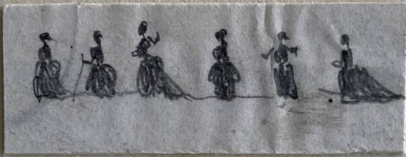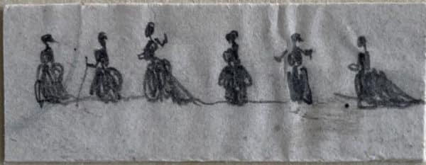 Mine de plomb sur papier. Quatre petites scènes de personnages en silhouettes, 1,5×4 cm, 2×5,5 cm, 3×7 cm, 2,5×10,5 cm. L’art d’être grand-mère, jeux collectifs à Nohant.