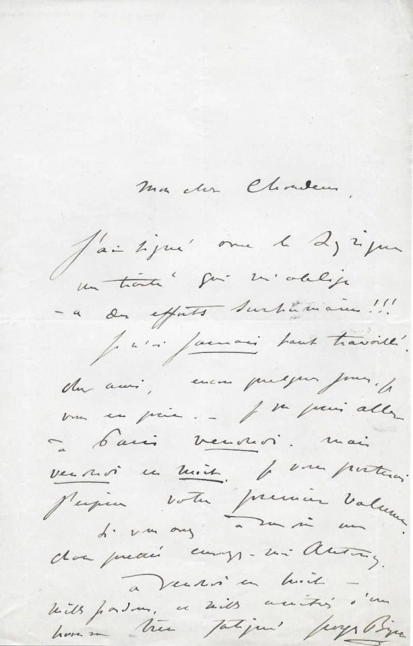 Bizet travaille d’arrache pieds à sa nouvelle création : « Mon cher Choudens, J’ai signé avec le Lyrique un traité qui m’oblige à des efforts surhumains !!! Je n’ai jamais tant travaillé. Cher ami, encore quelques jours, je vous en prie.. Je ne puis aller à Paris vendredi. Mais vendredi en huit. Je vous porterai j’espère notre premier volume (…) Mille pardons, et mille amitiés d’un homme bien fatigué… »