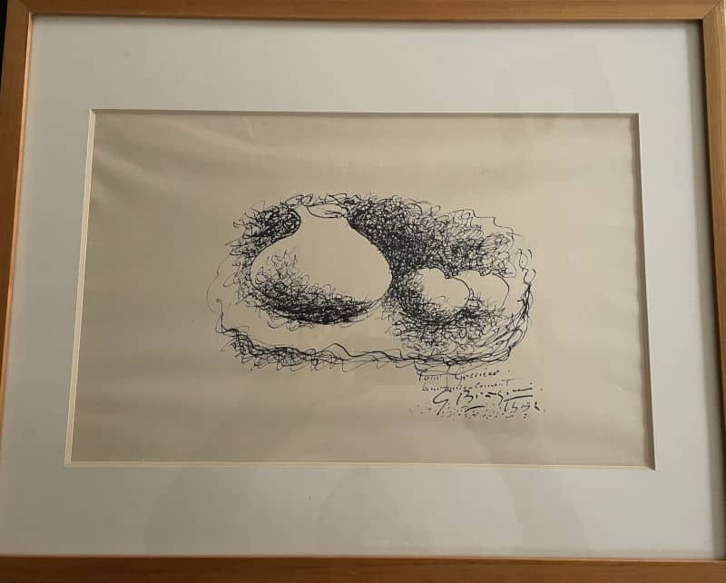 Jean Grenier est formé à l’esthétisme depuis son adolescence, s’imprégnant de la lumière des bords de la Méditerranée. A l’âge adulte, nombre de ses amis sont artistes eux-mêmes, parmi eux Max Jacob, Dubuffet et Jacques Busse. Mais c’est surtout sa longue collaboration et son amitié avec Jean Paulhan qui développe son intérêt pour l’esthétique. Cette collaboration l’amène naturellement à la critique. En septembre 1944, son ancien élève Albert Camus lui demande de prendre la rubrique artistique du journal Combat. Jean Grenier s’y investit pleinement, de ses rencontres naissent des amitiés avec de nombreux peintres dont Debré, Estève, Soulages, Alechinsky, Atlan, ou encore Messsagier. Il est nommé par la suite professeur à l’université Farouk 1er à Alexandrie de 1945 à 1950. En 1955, il écrit des articles pour l’Oeil, collabore également pour L’Express, La Nef, Preuves, la N.R.F, XXe Siècle, Derrière le Miroir et La Galerie des arts. En 1962, Jean Grenier est nommé à la chaire d’Esthétique et de Science de l’art à la Sorbonne. De 1959 à 1961, il est en charge de la rubrique l’Heure de Culture française à la RTF. C’est donc sur une période qui s’étend sur plus de trente années (1937-1971) que Jean Grenier interroge le monde artistique. Pour ses rubriques, il part de l’homme dans son milieu de vie ou de travail. Et avant l’homme sa demeure, l’atelier où il travaille : Picasso à l’hôtel des Grands Augustins à la Libération de Paris, Braque dans sa maison près du Parc Montsouris, l’atelier « grand et clair, très éclairé, car il donne au midi », précise-t-il. Encore Braque dans un second portrait : « (…) Le voici qui entre : il est grand, robuste, les épaules carrées, plein d’une force tranquille ; d’une voix grave il s’exprime en sentences longuement méditées, et ses yeux bleus suivent dans l’espace la portée de ses paroles. », plus loin : « (…) il est resté fidèle à son pays natal. Tout Braque est là-dedans, dans cette fidélité, cette constance. ». Cette contextualisation est l’ébauche préalable indispensable pour aborder l’œuvre disait-il. (Sources : Patrick Corneau, 1er février 2004)