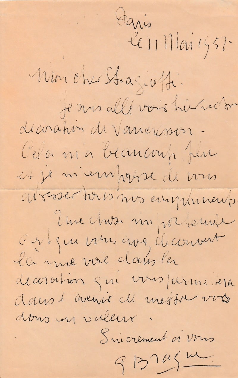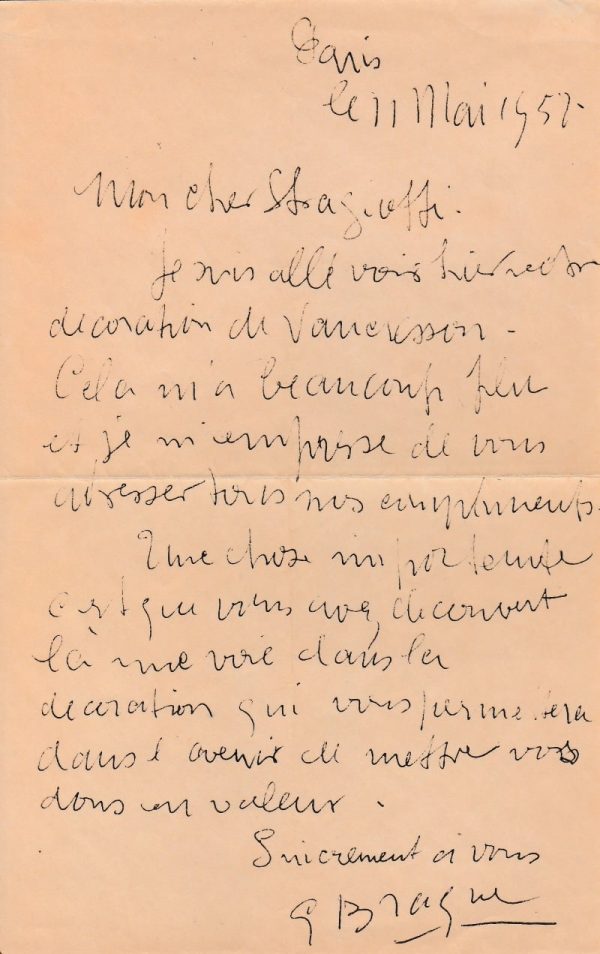 Jolie lettre amicale de Braque à Straggiotti : « Je suis allé voir hier votre décoration de Vaucresson. Cela m’a beaucoup plu et je m’empresse de vous adresser tous mes compliments. Une chose importante c’est que vous avez découvert là une voie dans la décoration qui vous permettra dans l’avenir de mettre vos dons en valeur…»