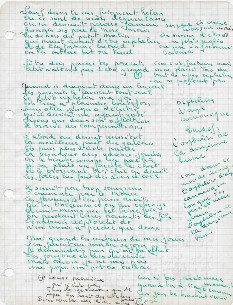 Manuscrit retrouvé d’une des dernières chansons que Brassens n’a pas eu le temps d’enregistrer avant sa mort, survenue le 29 octobre 1981. La chanson « L’orphelin » fut mise en musique par Brassens et interprétée en 1982 par Jean Bertola, puis par Maxime le Forestier.