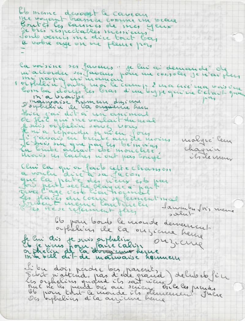 Manuscrit autographe de la chanson « L’orphelin ». S.l.n.d. ; 2 page in-4° sur papier quadrillé comportant des trous de classeur en marge sans atteinte au texte.