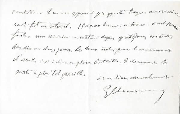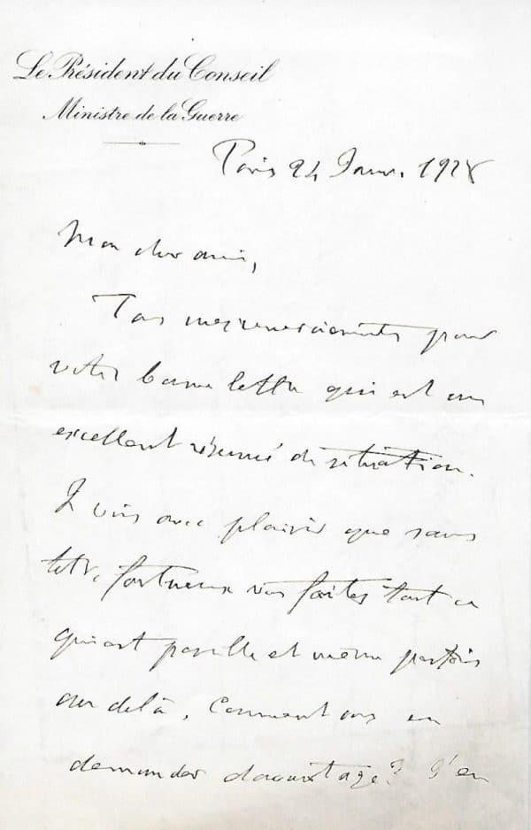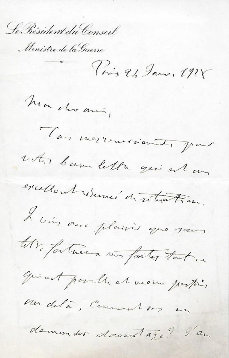 Lettre autographe signée à André Tardieu, commissaire général aux affaires de guerre franco-américaines à Washington. Paris, 24 janvier 1918 ; 3 pages in-8° sur son papier en-tête du président du conseil et ministre de la guerre. Enveloppe conservée