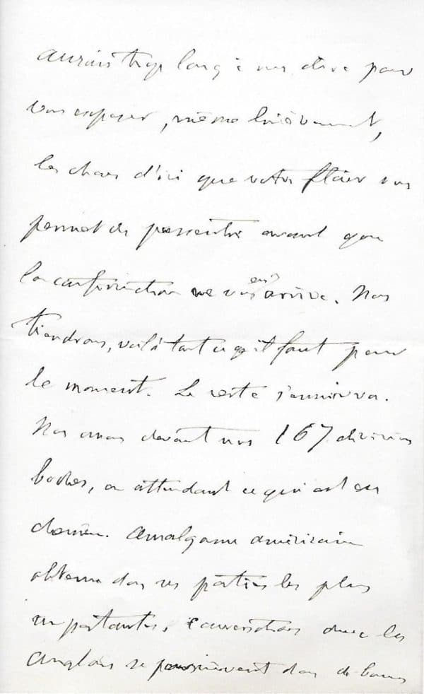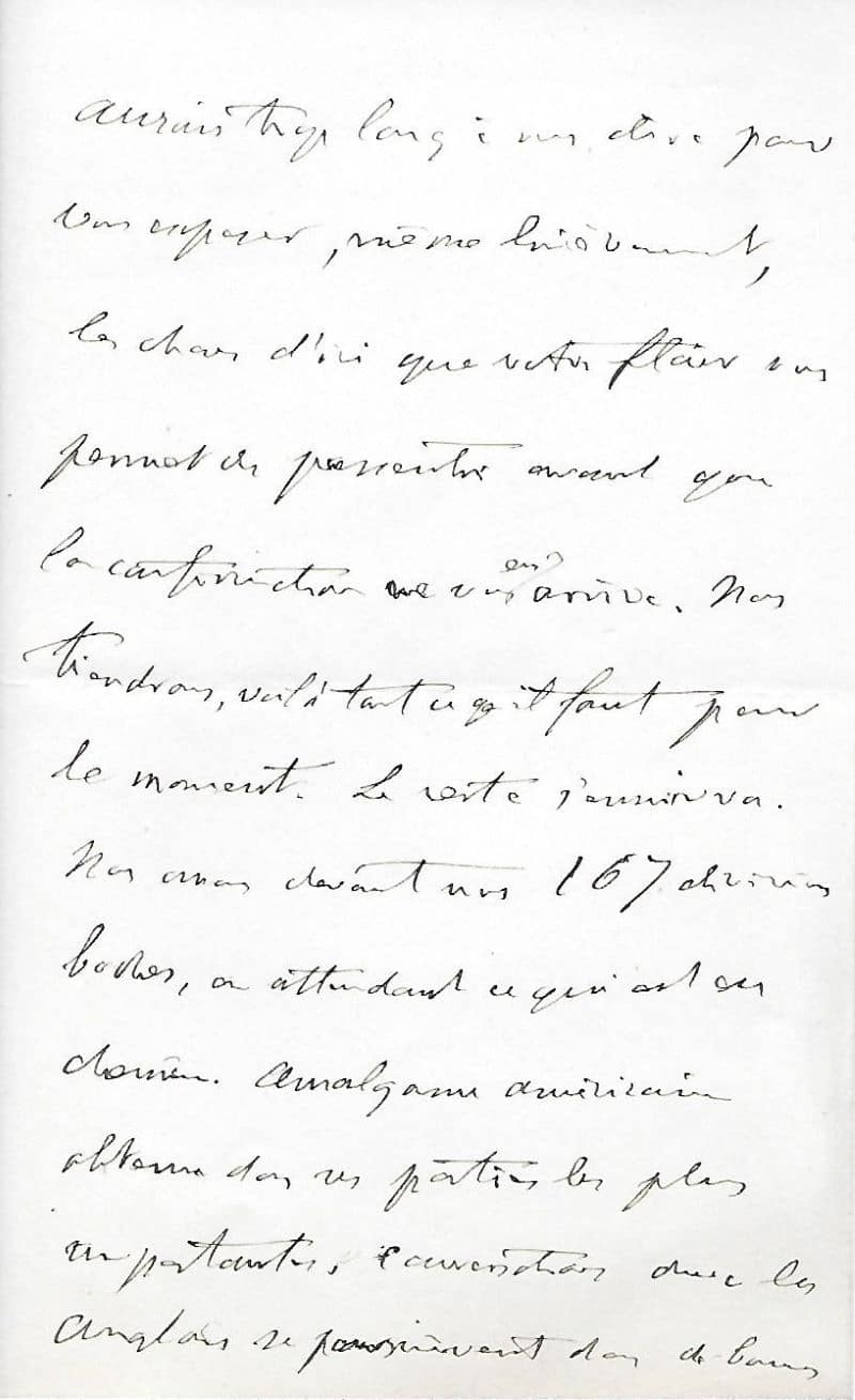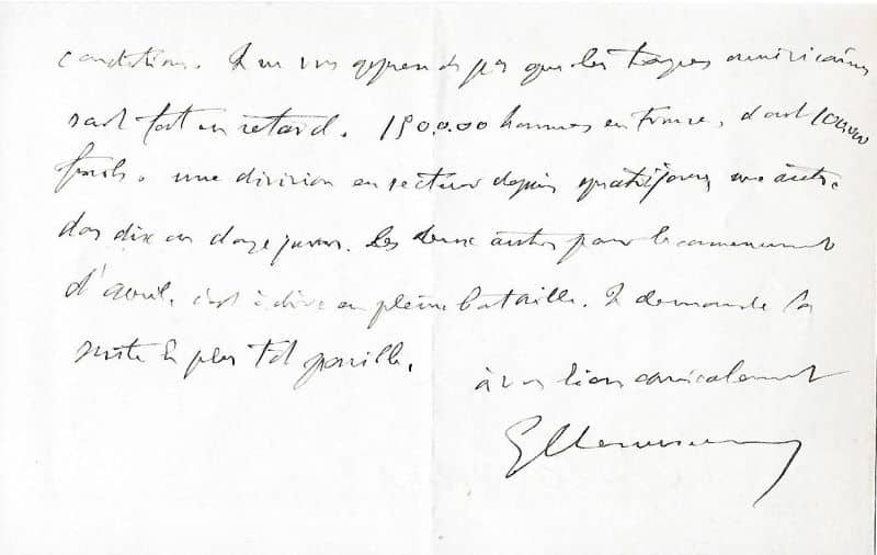 Le 16 novembre 1917, Clemenceau est nommé par le président Poincaré président du conseil, s’octroyant également le portefeuille de la guerre car comme il le disait : « La Guerre ! C’est une chose trop grave pour la confier à des militaires ! ». Il fait la chasse aux pacifistes et mate les révoltent et mutinerie. Son principe est simple, pour obtenir la paix il faut poursuivre la guerre à outrance et tenir le dernier. Pour cela il a besoin des colonies et du renfort des américains. Au début de l’année 1918, les alliés perdent un front avec la sortie du conflit de la Russie. Les allemands profitent de cette défection pour envoyer d’importants renforts sur le front ouest et tenter d’obtenir une victoire rapide avant l’arrivée effective des Américains. A ce moment critique de la guerre, Georges Clemenceau reste ferme : « Nous tiendrons, voilà tout ce qu’il faut pour le moment » indiquant à André Tardieu que « nous avons devant nous 167 divisions boches, en attendant ce qui est en arrière ». Il regrette le retard pris par les troupes américaines : « une division en secteur depuis quatre jours, une autre dans dix ou douze jours. Les deux autres pour le commencement d’avril, c’est à dire en pleine bataille » et « demande la suite le plus tôt possible. » : « Tous mes remerciements pour votre bonne lettre qui est un excellent résumé de situation. Je vois avec plaisir que sans titre fastueux vous faites tout ce qui est possible et même parfois au delà. Comment vous demandez davantage ? J’en aurais trop long à vous dire pour vous exposer, même brièvement, les choses d’ici que votre flair vous permet de pressentir avant que la confirmation ne vous en arrive. Nous tiendrons, voilà tout ce qu’il faut pour le moment. Le reste s’ensuivra. Nous avons devant nous 167 divisions boches, en attendant ce qui est en arrière. Amalgame américain obtenu dans ses parties les plus importantes. Conversations avec les Anglais se poursuivent dans de bonnes conditions. Je ne vous apprends pas que les troupes américaines sont fort en retard. 150000 hommes en France, dont 100000 fusils, une division en secteur depuis quatre jours, une autre dans dix ou douze jours. Les deux autres pour le commencement d’avril, c’est à dire en pleine bataille. Je demande la suite le plus tôt possible… »
