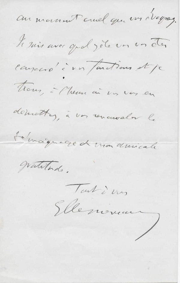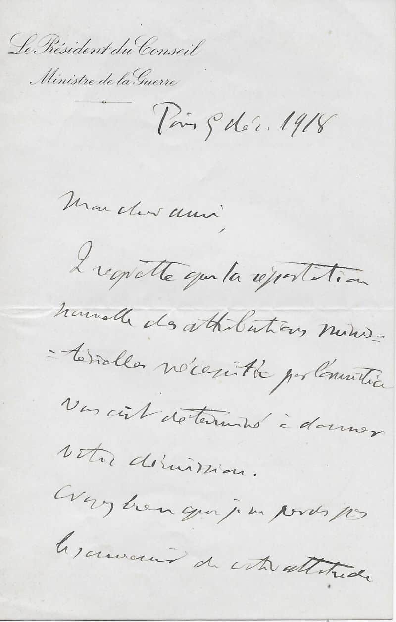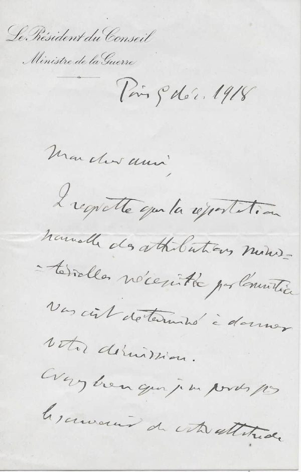 Rare lettre de Clemenceau à la sortie de la guerre, regrettant la démission de son secrétaire d’état aux transports maritimes et à la marine marchande : « Je regrette que la répartition nouvelle des attributions ministérielles nécessitée par l’armistice vous ait déterminé à donner votre démission. Croyez bien que je ne perds pas le souvenir de votre attitude au moment cruel que vous évoquez. Je sais avec quel zèle vous vous êtes consacré à vos fonctions et je tiens, à l’heure où vous vous en démettez, à vous renouveler le témoignage de mon amicale gratitude… »