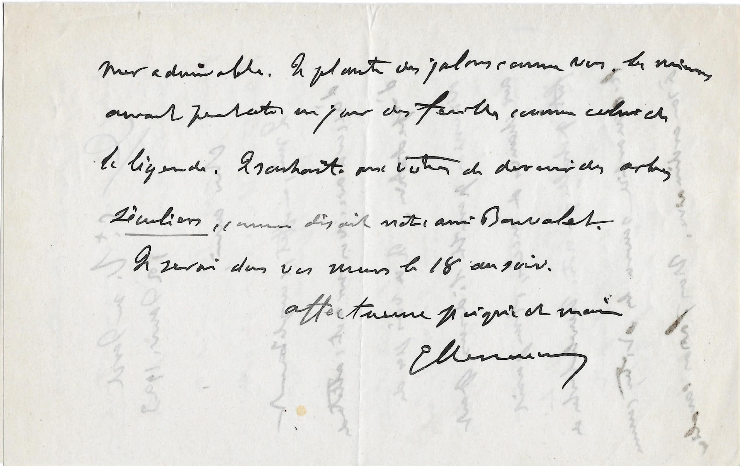 A l’aune de sa vie, le vieux tigre reste toujours de bons conseils et n’ai jamais à cours d’un coup de patte drolatique comme à son habitude : « Cher ami, Je suis, en effet, complètement d’accord avec vous sur votre attitude d’expectative. Je ne vois pas de discussion possible là dessus. Quant aux chances de succès, il me paraît fort probable que notre huluberlu de la couardise saura les éviter, comme à son ordinaire. Nous ferons cavalier seul, 1e parce que l’Angleterre nous lâche 2e parce que nous voulons toucher. Toucherons nous ? Je n’en vois pas les premiers signes. Pour ce qui est de l’Angleterre il n’y a pas de plus sotte politique que de s’épuiser en courbettes. C’est le meilleur moyen de se faire mépriser, sans même l’espoir d’une récompense honnête. J’ai essayé, l’autre soir, d’expliquer cela à l’un de vos futurs ministres qui naturellement ne m’a pas compris. Sauf l’intelligence, je lui reconnais tous les dons de l’esprit. Désablez vous pour la liberté du coup de reins. Beau soleil, mer admirable. Je plante des jalons comme vous. Les miens auront peut être un jour des feuilles comme celui de la légende. Je souhaite aux vôtres de devenir des arbres séculiers, comme disait notre ami Bonvalet. Je serai dans vos murs le 18 au soir. Affectueuse poignée de main… »