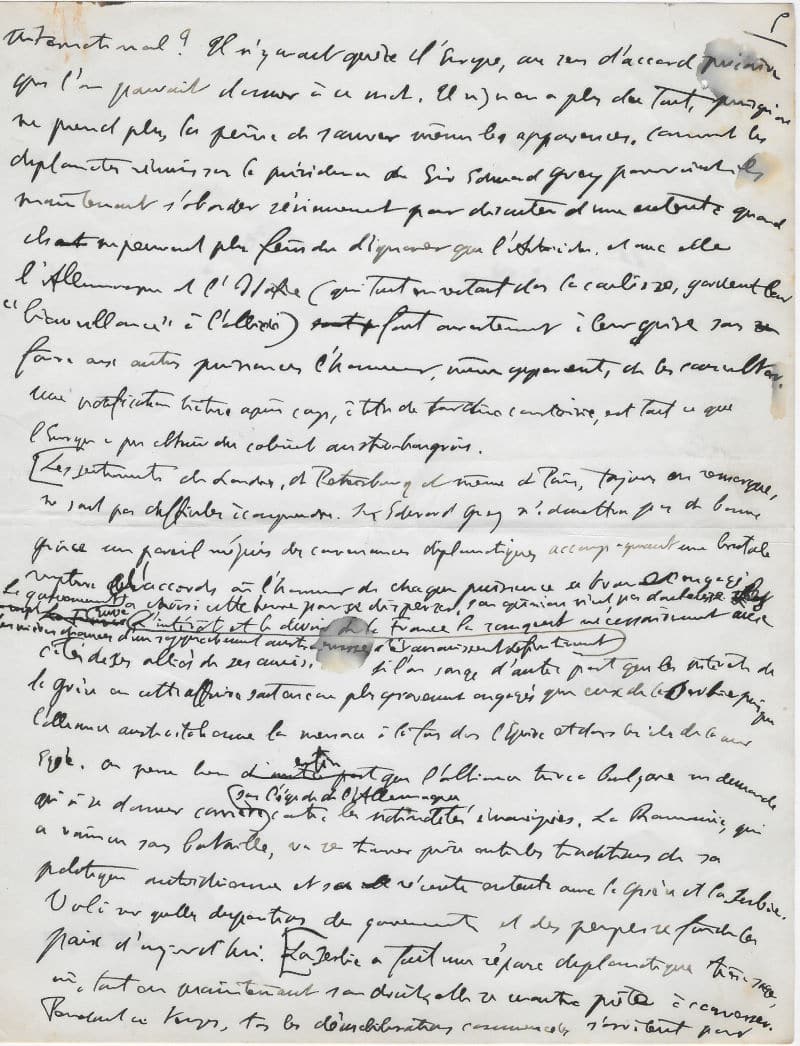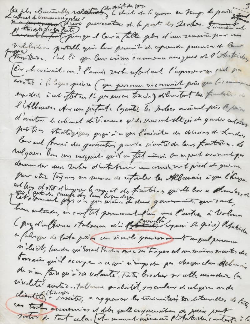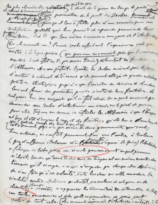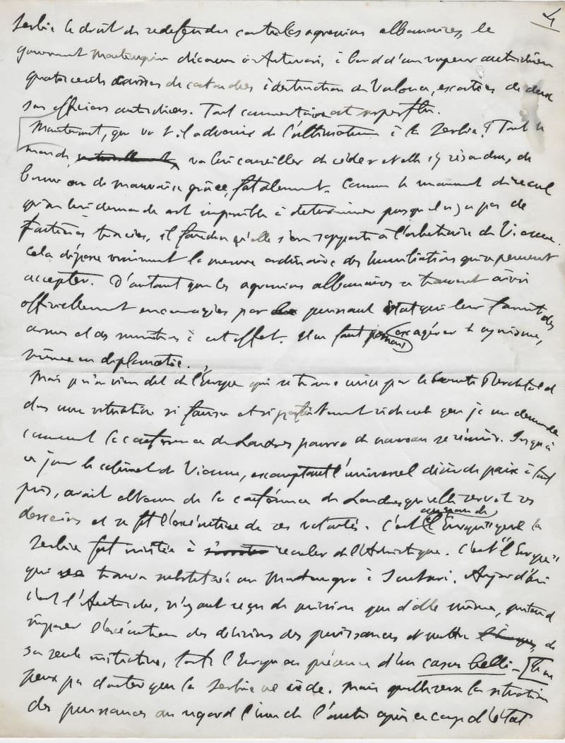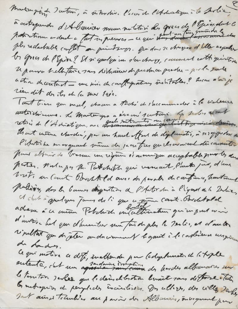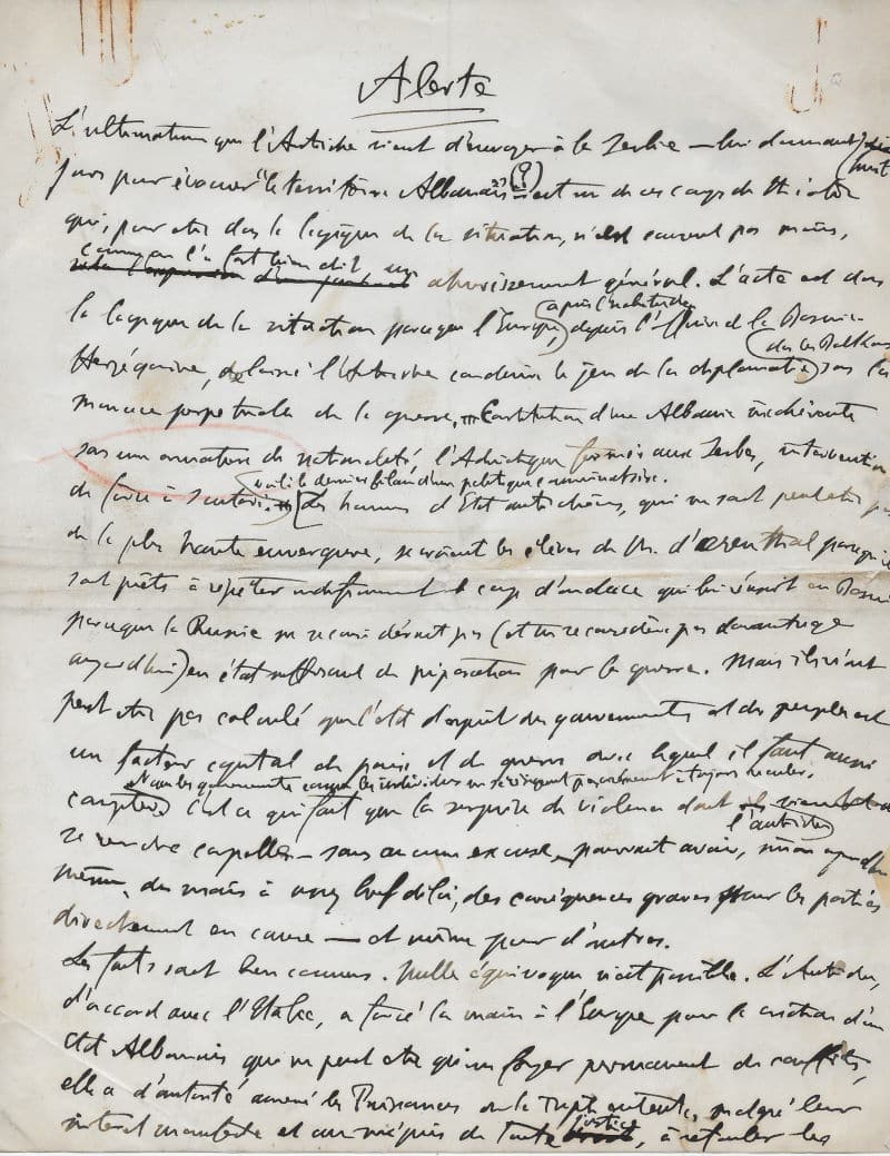 « L’ultimatum que l’Autriche vient d’envoyer à la Serbie en lui demandant de tout faire pour évacuer le territoire Albanais ( ?) est un de ces coups des Autrichien qui pour être dans la logique de la situation, n’est souvent pas moins, comme on l’a très bien dit un ahurissement général. L’acte est dans la logique de la situation parce que l’Europe a pris l’habitude depuis l’offensive de la Bosnie-Herzégovine, de laisser l’Autriche conduire le jeu de la diplomatie dans les Balkans sous la menace perpétuelle de la guerre, constitution d’une Albanie incohérente sans une…de nationalité, l’Adriatique fournie aux Serbes, intervention de force à soutenir les hommes d’Etat antichars, qui ne sait peut être pas de la plus haute envergure, serviront les élèves de M. d’Arenthal parce qu’ils sont prêts à répéter indifféremment le coup d’audace qui lui réussit en Bosnie parce que la Russie ne reconsidérait pas (et ne reconsidère pas davantage aujourd’hui) en état suffisant de préparation pour la guerre. Mais ils n’ont peut être pas calculé que l’état d’esprit du gouvernement et du peuple est un facteur capital de paix et de guerre avec lequel il faut aussi compter (…). C’est ce qui fait que la surprise de violence dont l’Autriche semble se rendre coupable – sans aucune excuse, pourrait avoir, même aujourd’hui même, du moins à assez bref délai, des conséquences graves sur les parties directement en cause – de même pour les autres. Les faits sont bien connus. Nulle équivoque n’est possible. L’Autriche, d’accord avec l’Italie, a forcé la main à l’Europe pour l’éviction d’un état Albanais qui ne peut être qu’un foyer permanent de conflits, elle a d’autorité amené les Puissances de la Triple entente, malgré leur intérêt manifeste et au mépris de toute justice (…) à interdire l’accès de l’Adriatique à la Serbie, à entreprendre d’Albaniser manu militari les Grecs de l’épine dont le patriotisme ardent a fait ses preuves – ce qui peut nous faire craindre le plus redoutable conflit au printemps. Qui donc se chargera d’elle amputer les Grecs de l’empire ? Et si quelqu’un s’en charge, comment cette privation se pourra t-elle faire sans déchainer des prêchi ou prêcha – par la seule action de contact- une série de conflagrations inévitables ? Encore n’ai-je rien dit des îles de mer Egée. Tant bien que mal, chacun a tâché de s’accommoder à la violence autrichienne. Le Montenegro a évacué Scutari. Les serbes se sont retirés de l’Adriatique, avec quels sentiments au cœur. Ils ont même cherché, par un haut effort de diplomatie, à se rapprocher de l’Autriche en arguant même des sacrifices qu’ils avaient dû consentir pour obtenir de Vienne un régime économique acceptable pour les deux parties. N’est ce pas M. Pachitch qui vouait, l’autre jour, d’une sortie au comte de Rothchild avec des paroles de confiance, hautement publiques, dans les graves dispositions de l’Autriche à l’égard de la Serbie, et c’est à quelques jours que ce même comte Rothchild adresse à ce même Pachitch un brutal ultimatum qui ne peut avoir d’autre but que d’humilier une fois de plus la Serbie, et d’autre résultat que de jeter audacieusement le gant à la cohérence européenne de Londres. Ce qui motive ce défi, inattendu pour la diplomatie de la Triple entente, c’est une soudaine irruption des hardes albanaises sur les tentatives serbes (…). Toutes les autopsies des peuples incivilisés. Des villages, des villes serbes sont ainsi tombées au pouvoir des Albanais, invoquant pour les plus abominables violations du droit des gens, le droit de la guerre en temps de paix [phrases raturées] d’une provocation de la part des Serbes. L’accusation est contredite par les faits puisqu’il leur a fallu plus d’une semaine par une élucubration partielle qui leur permit de reprendre possession de leur frappe. C’est là que leur crime commence aux yeux de l’Autriche, l’armée serbe refoulant l’agresseur (…) à la ligne précise que personne ne connait puis que la commission (…) délimitant la frontière de l’Albanie. Avec une parfaite loyauté les Serbes avaient pris la peine d’avertir le cabinet de Vienne qu’ils avaient obligés de garder certaines parties stratégiques jusqu’à l’exécution des décisions de Londres leur eut fourni des garanties pour la sécurité de leurs frontières. Le vulgaire bon sens exigeait qu’il en fût ainsi. On ne peut vraiment pas demander aux Serbes d’entretenir une armée sur le pied de guerre pour être toujours en mesure de refouler les Albanais à qui l’Europe est hors d’état d’imposer le respect des frontières qu’elle leur a données, et que l’Autriche couve de leurs brigandages. Cet étonnant pays n’a pas moins de deux gouvernements qui sont, bien entendu, en conflit permanent l’un vers l’autre. A Valona [ville de l’actuelle Albanie] (pays d’influence italienne (…)) l’Autriche a fabriqué de toutes pièces un gouvernement auquel personne n’obéit, tandis qu’Essad Pacha [officier de l’armée ottomane il devient dictateur de l’Albanie en octobre 1914] avec ses troupes est au moins maître du terrain qu’il occupe et ce qui n’empêche pas chaque clan albanais de n’en faire qu’à sa volonté. Faites brocher par cette anarchie la vivacité italienne qu’aboutit, sans couleur de religion ou de clientèle étrangère a susciter, à aggraver les inimitiés traditionnelles (…) quelle organisation de paix peut sortir de tout cela. Au moment même où l’Autriche conteste à la Serbie le droit de se défendre contre les agressions albanaises, le gouvernement Monténégro découvre à Antivari [ville du Montenegro], à bord d’un vapeur autrichien quatre cents caisses de cartouches à destination de Valona, escortées de deux sous officiers autrichiens. Tout 