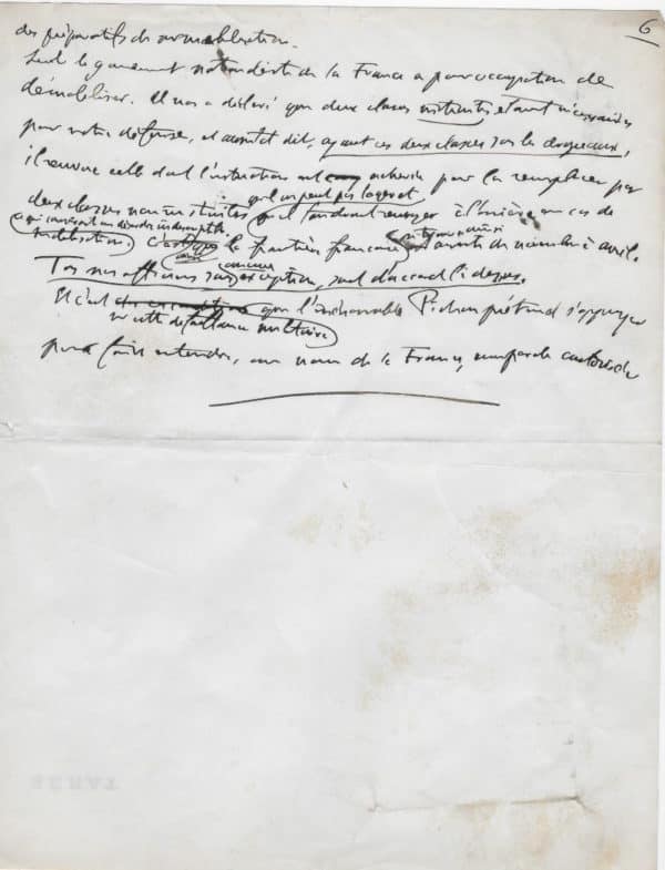 Article avec de nombreuses ratures, annotations, rajouts en vue d’être publié dans le quotidien de Clemenceau, « l’Homme libre », début juillet 1914.