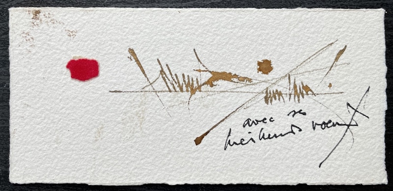 Dessin original peinture dorée, encre et tissu sur carton, dédicacé « avec ses meilleurs vœux »