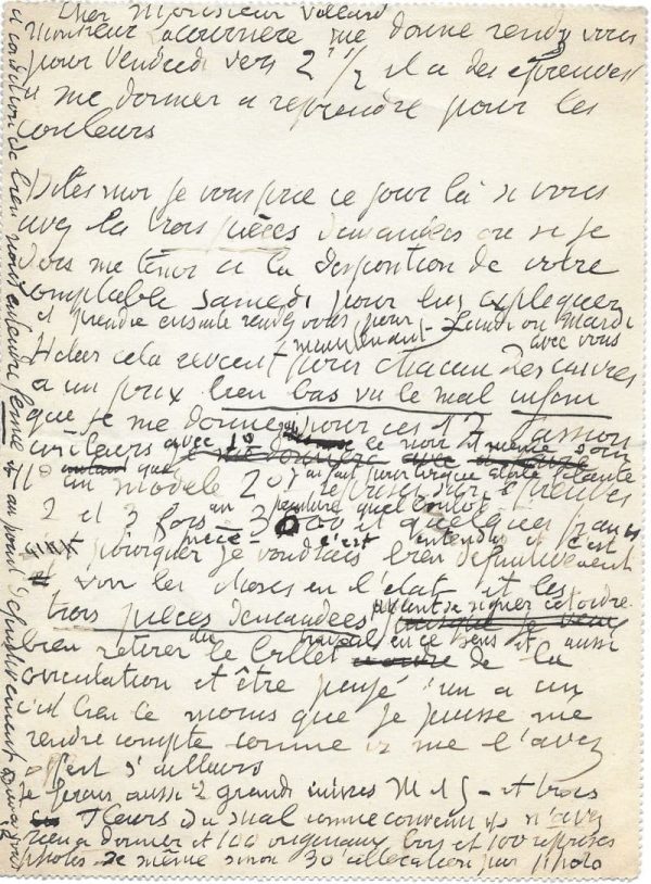 Belle lettre entre l’artiste et son marchand sur l’édition de la Passion et la transaction de différentes œuvres : « Cher Monsieur Vollard, Monsieur Lacourriere me donne rendez-vous pour vendredi vers 2h ½ il a les épreuves à me donner & reprendre pour les couleurs. Dites moi je vous prie ce jour là si vous avez les trois pièces demandées ou si je dois me tenir à la disposition de votre comptable samedi pour lui expliquer et prendre ensuite rendez vous pour Lundi ou mardi avec vous. Hélas cela revient maintenant pour chacune des œuvres à un prix bien bas vu le mal infini que je me donne pour ces 17 Passions couleurs avec 10 le noir et même soin que j’ai fait pour Cirque étoile filante 1° un modèle 2° reprises sur épreuves 2 et 3 fois au – [moins] quel boulot 3000 et quelques francs pièce c’est entendu et c’est parce que je voudrais bien définitivement voir les choses en l’état et les trois pièces demandées avant de signer cet ordre du travail en ce sens et aussi bien retirer le billet de la circulation et être payé un à un c’est bien le moins que je puisse me rendre compte comme vous me l’avez offert d’ailleurs. Je ferai ( …) trois Fleurs du mal comme convenu vous n’avez rien à donner et 100 originaux bois et 100 reprises photos à condition de bien nous entendre ferme et au point définitivement…. …»