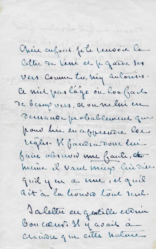 Sand est rassurée que le fils de son neveu ne soit pas corrompu par « l’esprit prêtre » : « Chère enfant, Je te renvoie la lettre de René et je garde ses vers comme tu m’y autorises. Ce n’est pas l’âge où l’on fait de beaux vers, et on ne lui en demande probablement que pour lui en apprendre les règles. Il faudra donc lui faire observer une faute, et même il vaut mieux lui dire qu’il y en a une, et qu’il ait à la trouver tout seul. Sa lettre est gentille et d’un bon cœur. Il y avait à craindre que cette nature douce ne fût absorbée par l’esprit prêtre, et je vois avec plaisir que sa générosité naturelle s’en défend. C’est un bon et brave enfant qui te rendra heureuse. Embrasse les tous trois pour moi et dis toutes mes amitiés à ta nièce… »
