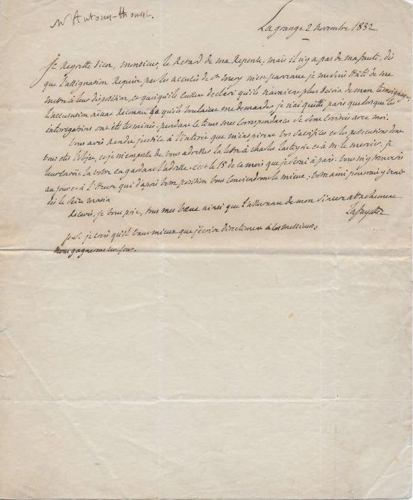 Thouret en proie à des soucis avec la justice, lié à ses engagements politiques contre la monarchie de Juillet, reçoit le secours enthousiaste de La Fayette : « Je regrette bien, Monsieur, le retard de ma réponse, mais il n’y a pas de ma faute. Dès que l’assignation requise par les accusés de St Mery m’est parvenue je me suis hâté de me mettre à leur disposition, ce quoi qu’ils eussent déclaré qu’ils n’avaient plus servir de mon témoignage. L’accusation aïant reconnu là ce qu’ils voulaient me demander, je n’ai quitté Paris que lorsque les interrogations ont été terminées. Pendant ce tems mes correspondances se sont croisées avec moi. Vous avoir rendu justice à l’intérêt que m’inspirent vos sacrifices et les persécutions dont vous êtes l’objet, et je m’empresse de vous adresser la lettre à Charles Lartignie ( ?) et à M. Lemercier. Je leur envoie la vôtre en gardant l’adresse. C’est le 15 de ce mois que je serai à Paris. Vous m’y trouverez au jour et à l’heure qui d’après votre position vous conviendra le mieux. Votre ami pourrait y venir dès le seize matin. Recevez, je vous prie, tous mes vœux ainsi que l’assurance de mon sincère attachement. p.s. je crois qu’il vaut mieux que j’écrive directement à ces messieurs, nous gagnerons un jour… »
