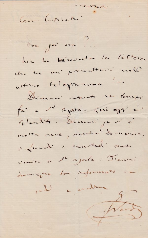 dal Corticelli al verso: Genova 9 febbraio 1877) – « Dove sei ora? Non ho ricevuta la lettera che tu mi promettevi nell’ultimo telegramma! Dimmi intanto che tempo fà a St. Agata. Qui oggi è splendido. Dimmi se vi è molta neve, perché domenica, lunedì, martedì conto venire a St. Agata.Tienimi dunque ben informato. ». Scrive da Genova dove a! partire dal settembre 1874 in un mezzanino di Palazzo del Principe, Verdi e Giuseppina risiedevano nei periodi invernali.
