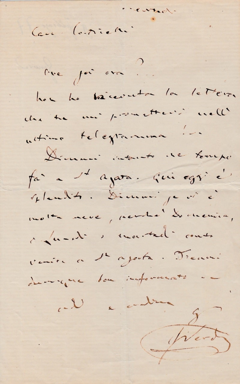 Verdi écrit de Gênes où il réside avec sa femme, Giuseppina, à partir de septembre 1874. Il s’inquiète de ne pas avoir de nouvelles de Corticelli. Il lui demande quel temps il fait car il compte venir dimanche, lundi et mardi à Sainte Agathe.