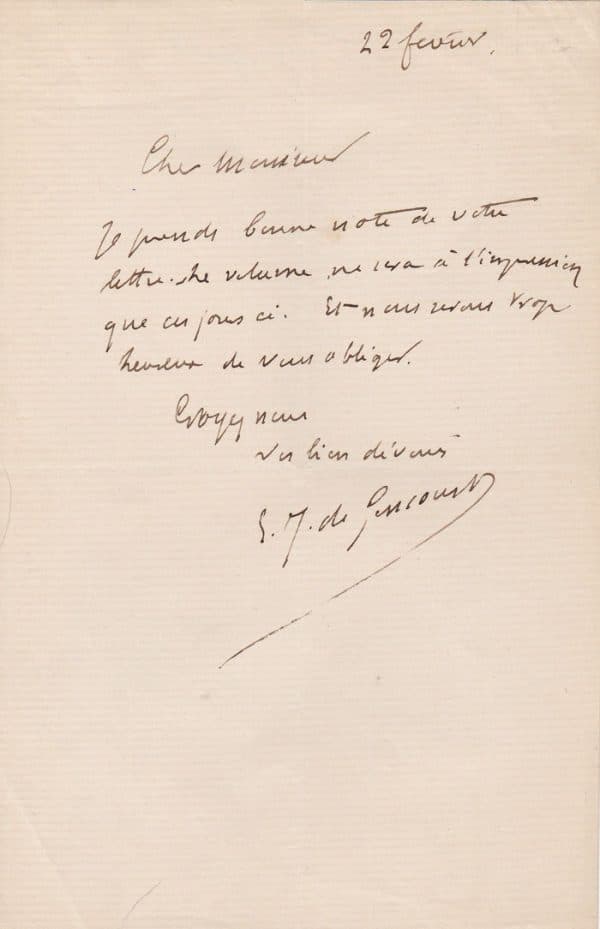 «Cher Monsieur Je prends bonne note de votre lettre. Le volume n’ira à l’impression que ces jours ci. Et nous restons trop heureux de vous obliger… »