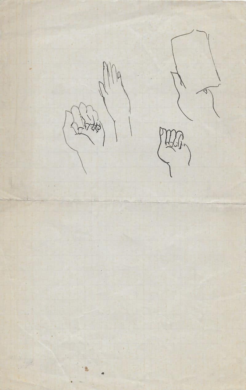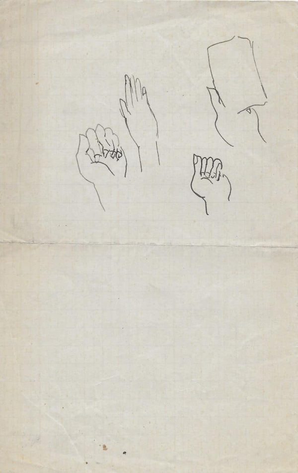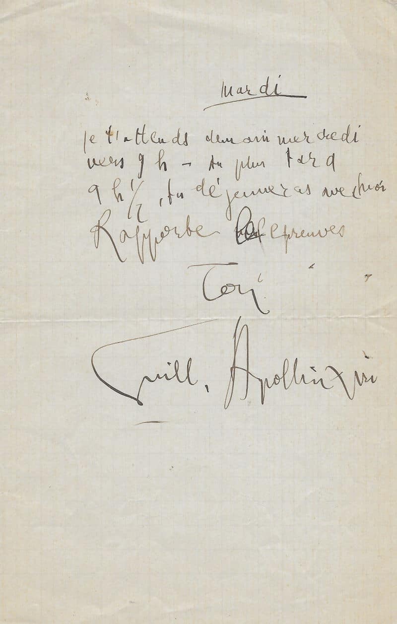 Apollinaire demande de rapporter ses épreuves. Au dos du billet figure quatre dessins d’Apollinaire représentant différentes positions de la main : poing fermé, main ouverte, doigts pliés, une main tenant une feuille : « Je t’attends demain mercredi vers 9h – de plus sera 9h1/2 tu déjeuneras avec moi. Rapporte les épreuves ton Guill. Apollinaire »