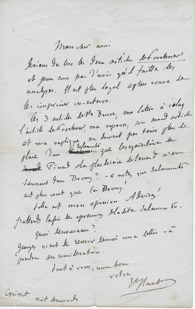 Belle lettre au sujet de la préparation des nouvelles éditions de Madame Bovary et de Salammbô chez l’éditeur Georges Charpentier. Flaubert avait souhaité intégrer en annexes, pour Madame Bovary, les pièces du procès qui l’avait acquitté et pour Salammbô, les articles de Saint Beuve et de l’orientaliste Froehner qui avaient mis en cause la rigueur de ses recherches historiques. Pour Salammbô seul seront intégrées ses réponses aux critiques : « Je viens de lire les deux articles de Froehner et je ne suis pas d’avis qu’il faille les analyser. Il est plus loyal & plus crane de les imprimer in-extenso. Les 3 articles de Ste Beuve, ma lettre à Iceluy, l’article de Froehner, ma réponse, son second article et ma réplique ne doivent pas tenir plus de place dans le volume de Salammbô que le réquisitoire de Pinard & la plaidoirie de Senard n’en tiennent dans Bovary ! – notez que Salammbô est plus court que la Bovary ! Telle est mon opinion. Advisez ! J’attends la fin des épreuves de la dite Salammbô. Quoi de nouveau ? Georges [Charpentier] vient de recevoir de moi une lettre à prendre en considération… »