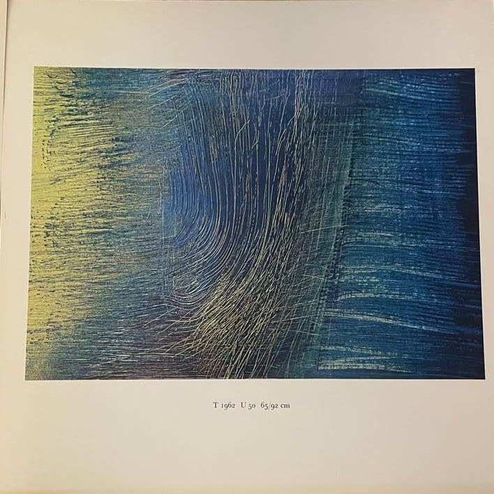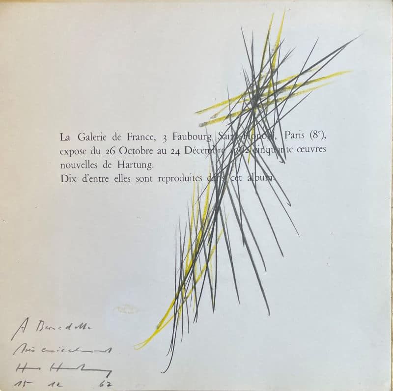Hans Hartung s’oriente très tôt vers l’abstraction alors qu’il a fui l’Allemagne nazie pour s’installer à Paris. Dans les années 30, il perfectionne sa méthode qu’il qualifie de « spontanéité calculée ». Mais il met du temps à se faire reconnaitre. Il s’engage dans la légion étrangère durant la guerre et y laisse une jambe. De retour à Paris, il participe à ses premières expositions, à la Biennale de Venise, un film lui est consacré. Un changement stylistique majeure s’opère en 1960, quand il découvre les peintures industrielles qui lui permet de sauter l’étape du dessin préparatoire avant la mise en couleur, pour attaquer spontanément la toile à l’acryliques et vinyliques, qu’il gratte en des formes zébrées sur de grand format. La renommée arrive, Hartung est très demandé, il expose en Europe et aux Etats-Unis.
