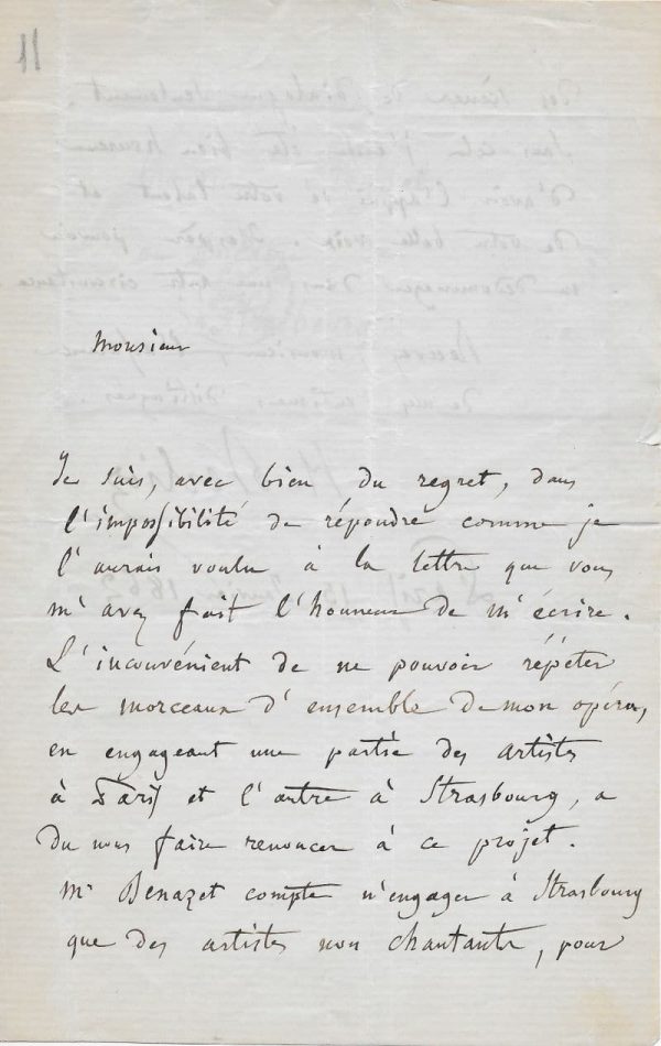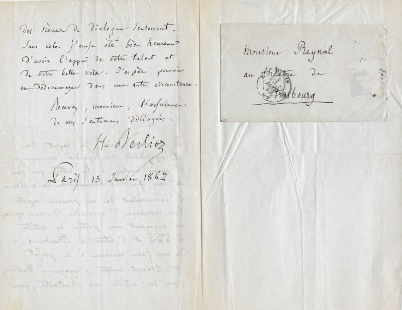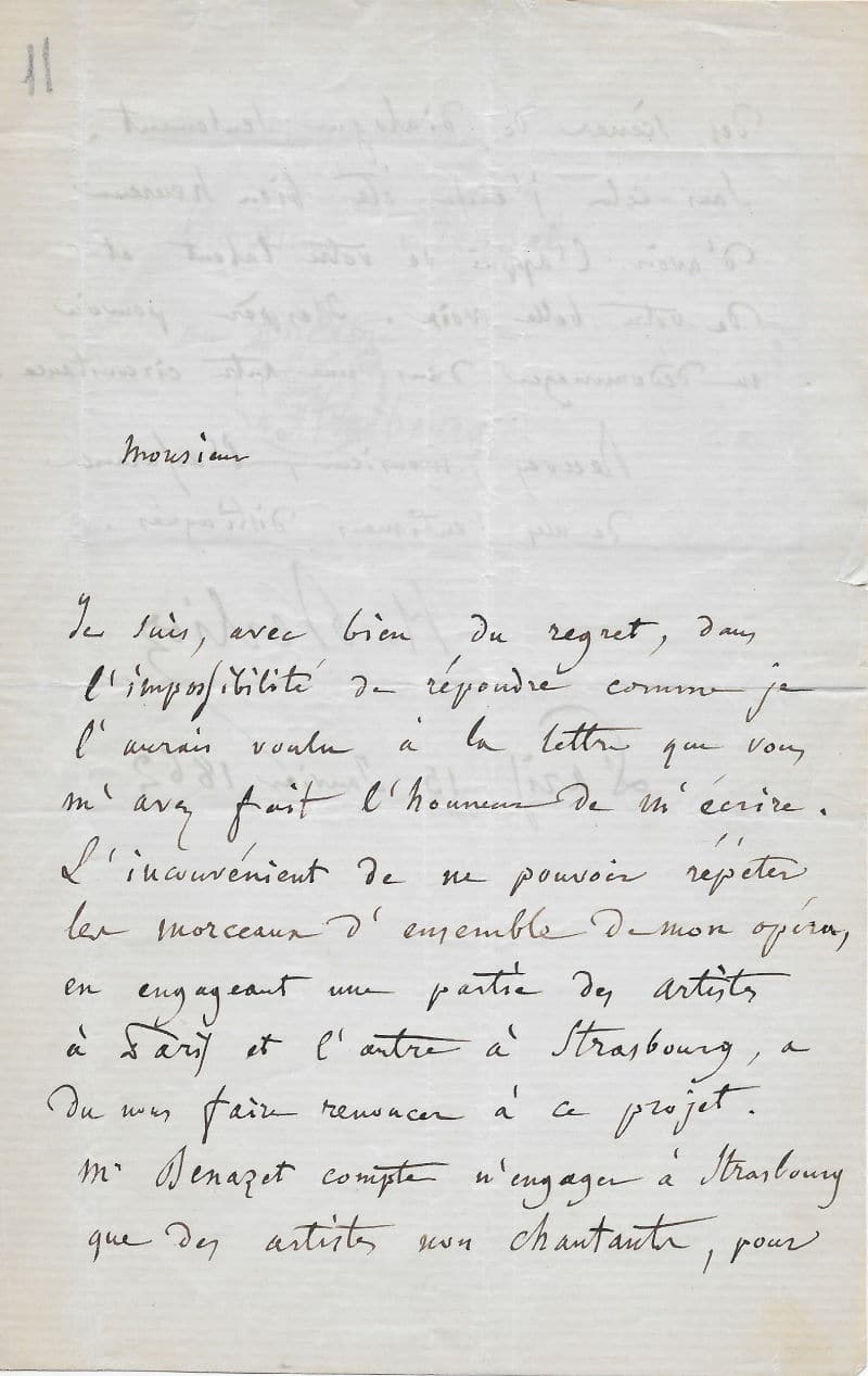Le compositeur se désole de ne pouvoir faire appel au talent du baryton Osmond Reynal pour son opéra Béatrice et Bénédict : « Je suis, avec bien du regret, dans l’impossibilité de répondre comme je l’aurais voulu à la lettre que m’avez fait l’honneur de m’écrire. L’inconvénient de ne pouvoir répéter les morceaux d’ensemble de mon opéra [Béatrice et B,énédict] en engageant une partie des artistes à Paris et l’autre à Strasbourg, à dû nous faire renoncer à ce projet. Mr Bénazet [Edouard Bénazet directeur du festival de Bade en Allemagne] compte n’engager à Strasbourg que des artistes non chantants, pour des scènes de dialogues seulement. Sans cela j’eusse été bien heureux d’avoir l’appui de votre talent et de votre belle voix. J’espère pouvoir me dédommager dans une autre circonstance (…) »