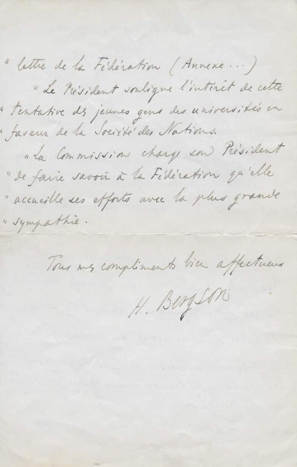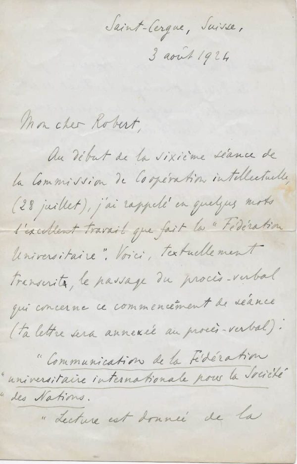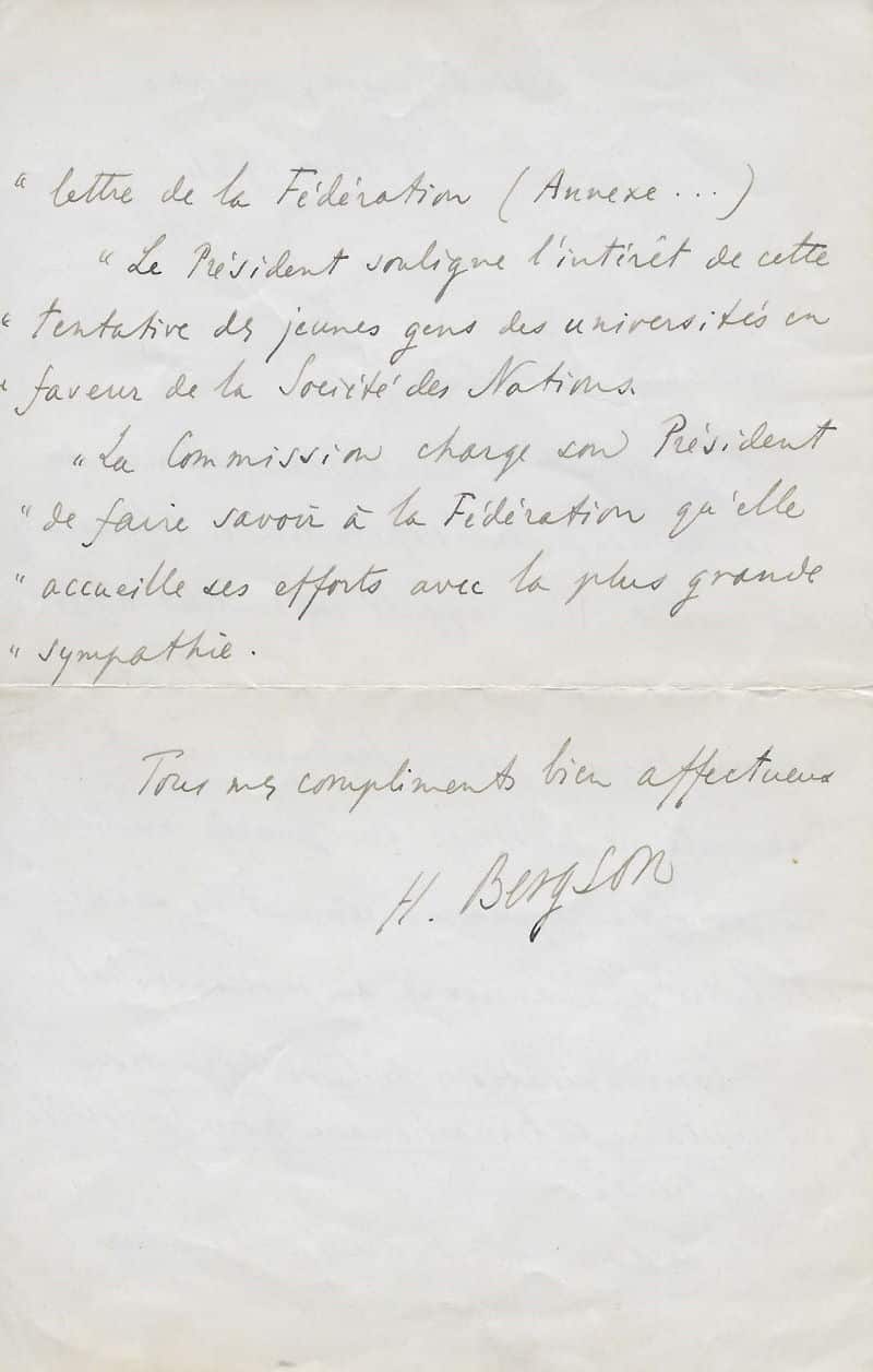 Bergson rappelle l’excellent travail que fait la jeunesse universitaire pour la Commission International de Coopération Intellectuelle (futur UNESCO) dont il est le premier président : « Mon cher Robert, Au début de la sixième séance de la Commission de Coopération intellectuelle, (28 juillet), j’ai rappelé en quelques mots l’excellent travail que fait la « Fédération Universitaire ». Voici, textuellement transcrit, le passage du procès-verbal qui concerne ce commencement de séance (ta lettre sera annexée au procès-verbal). « Communication de la Fédération universitaire internationale pour la Société des Nations. « Lecture est donnée de la lettre de la Fédération (Annexe…) « Le Président souligne l’intérêt de cette tentative des jeunes gens des universités en faveur de la Société des Nations. « La Commission charge son Président de faire savoir à la Fédération qu’elle accueille ses efforts avec la plus grande sympathie »… »