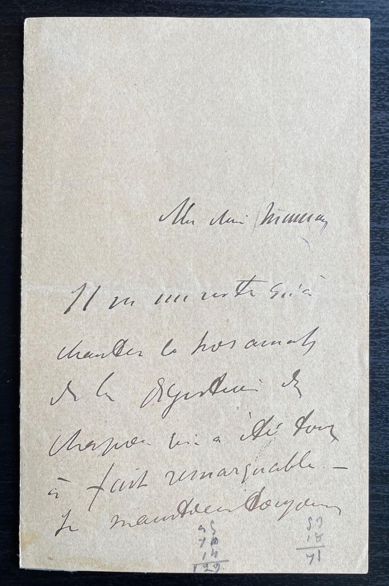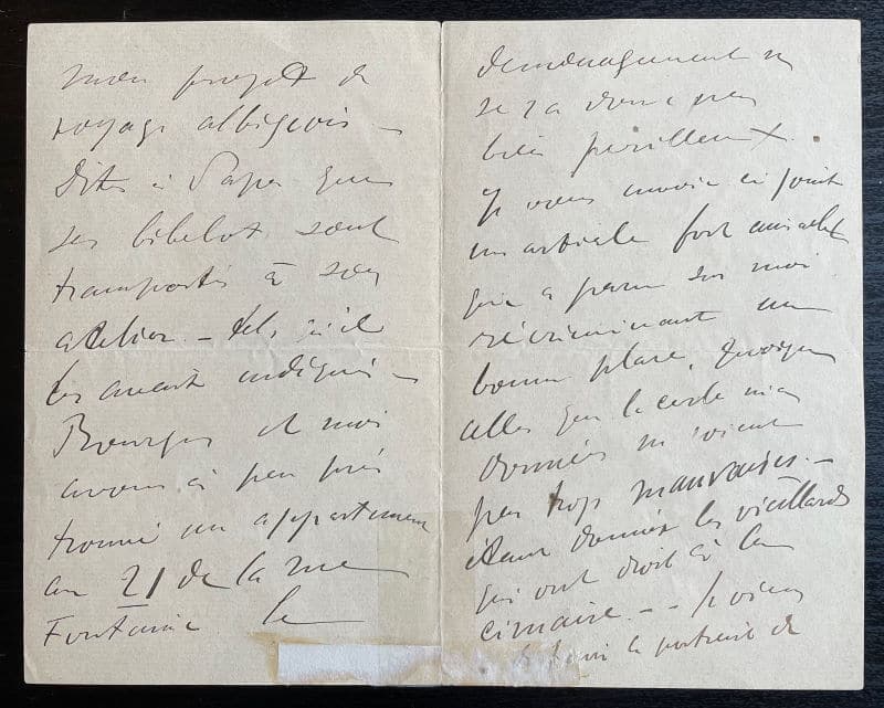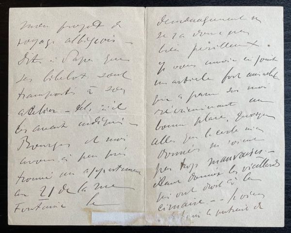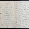 Riche lettre du peintre Montmartrois évoquant son actualité : « Il ne me reste qu’à chanter le Hosannah de la digestion du chapon qui a été tout à fait remarquable. Je maintiens toujours mon projet de voyage albigeois. Dites à papa que ses bibelots sont transportés à son atelier – tels qu’il les avait indiqués. Bourges et moi avons à peu près trouvé un appartement au 21 de la rue Fontaine, le déménagement ne sera donc pas bien périlleux. Je vous envoie ci-joint un article fort aimable qui a paru sur moi [article de Jules Antoine dans le journal La Plume du 13 février 1891 où le dessin de Toulouse Lautrec est comparé à celui d’Edgar Degas], récriminant une bonne place, quoique celle que le Cercle m’a données ne soient pas trop mauvaises, étant donné les vieillards qui ont droit à la cimaise [allusion ici à sa participation à l’exposition du Cercle artistique et littéraire Volney qui eut lieu du 26 janvier au 24 février 1891]. Je viens de faire le portrait de Gaston Bonnefoy et viens de commencer celui de Louis. J’espère qu’ils ne seront pas trop laids. Sur ce je vous souhaite des digestions copieuses pour le mardi gras [10 février 1891] précédent celles plus venteuses du Carême [5 mars 1891]. Et vous embrasse tous. Yours… »