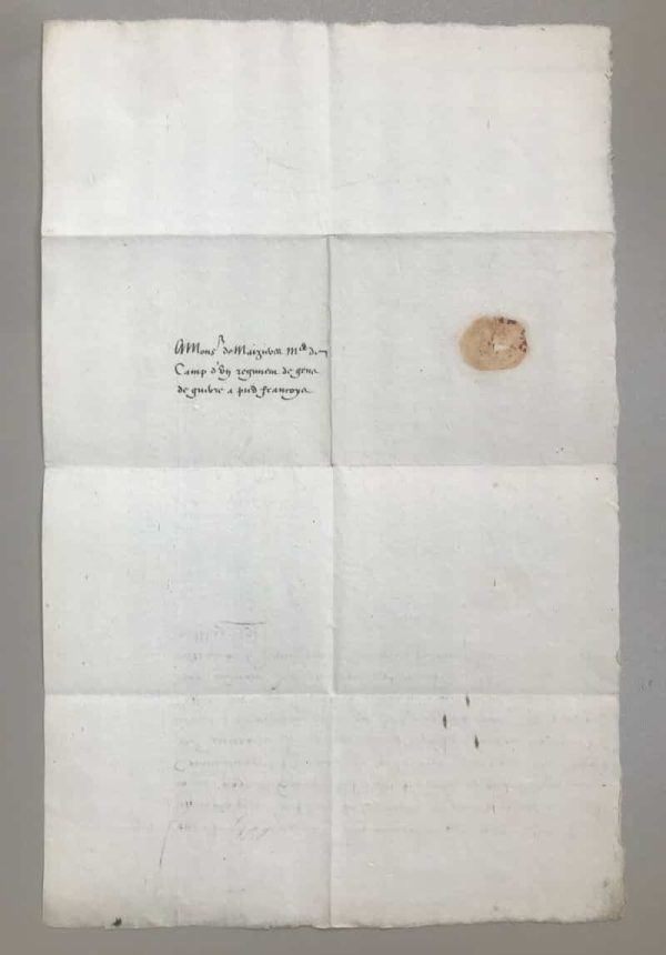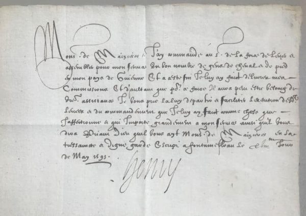 Le roi ordonne à Monsieur de Maizières, maître de camp, d’affecter à son service un bon nombre de gens de cheval et de pied, du pays de Guienne (région bordelaise longeant l’océan au sud jusqu’à la Navarre), finissant sa missive par la formule rituelle : « priant Dieu qu’il vous ait, Monsieur de Mezieres, en sa puissante et digne garde ».