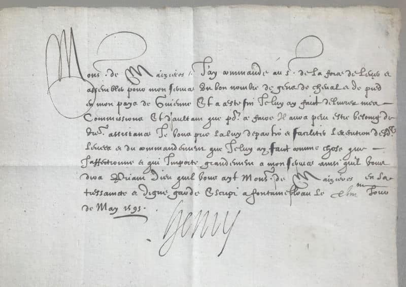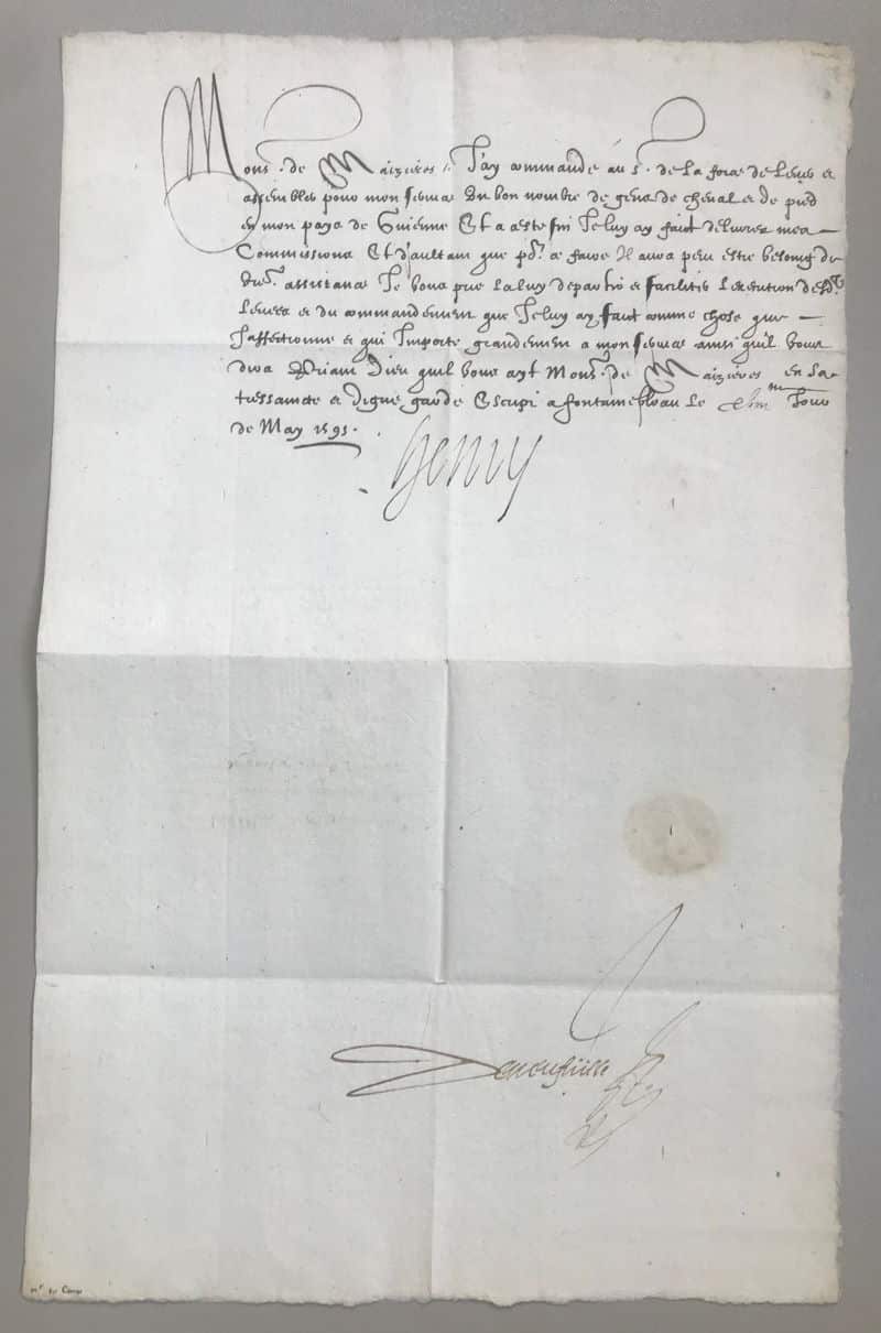 Lettre manuscrite signée « Henry » à l’attention de Monsieur de Maizière, contresignée par son secrétaire d’état Nicolas de Neufville, Seigneur de Villeroi. Fontainebleau, 8 mai 1593 ; 1 page in-folio avec adresse au dos. Papier filigrané orné d’un blason avec la lettre « N » (Navarre). Adresse du destinataire au dos avec résidu de cachet de cire rouge.
