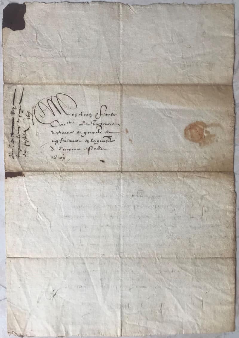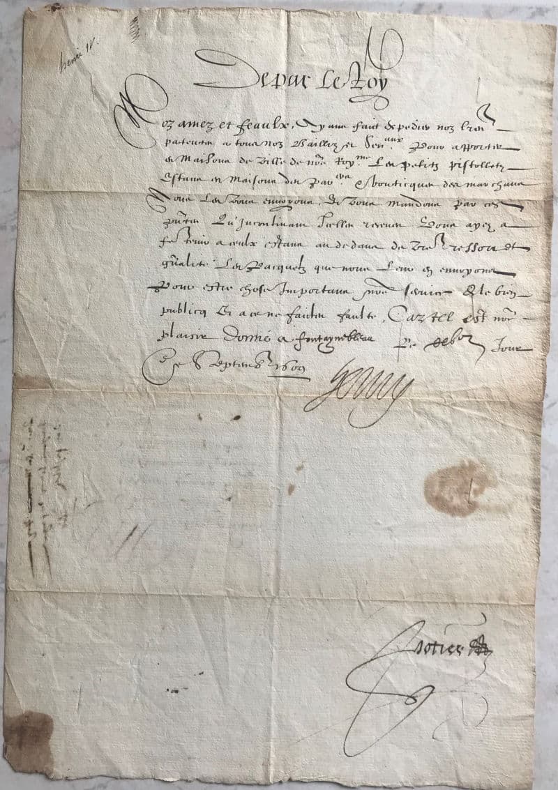Le roi ordonne aux baillis et sénéchaux du royaume : « Nos amez et feaux, ayant faict expédier nos lettres patentes à tous nos Bailliz et Senechaux pour apporter ès maisons de ville de nostre royaume les petitz pistollez estans ès Maisons des particuliers et boutiques des marchans. Nous les vous envoyons et vous mandons par ces presentes qu’incontinent icelles receues vous ayez à faire tenir à ceulx estans audedans de votre ressort et generalité les pacquetz que nous leur envoyons pour estre chose importante notre service et le bien publicq et a ce ne fairtes fautte car tel est notre plaisir. Donné à fontaynebleau le XVe jour de septembre 1609… »