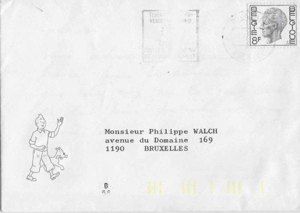 Carte autographe au journaliste belge Philippe Walch. S.l.n.d. ; 1 page in-12° oblong. Enveloppe à l’effigie de Tintin et Milou jointe.