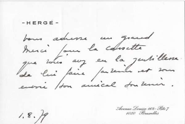 Mot de remerciement suite à l’envoi de la cassette sur laquelle avait été enregistrée l’interview : « (Hergé) Vous adresse un grand merci pour la cassette que vous avez eu la gentillesse de lui faire parvenir et vous envoie son amical souvenir »
