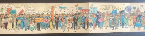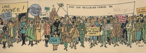Superbe carte de vœux signée par Hergé représentant l’ensemble des personnages présentant dans les différents albums des Aventures de Tintin.