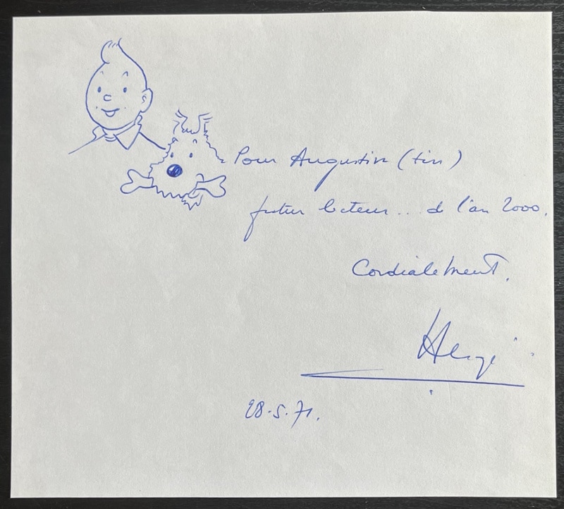 Beau dessin du maître de la ligne claire agrémenté de cette savoureuse dédicace : « Pour Augustin(tin) futur lecteur…de l’an 2000 »