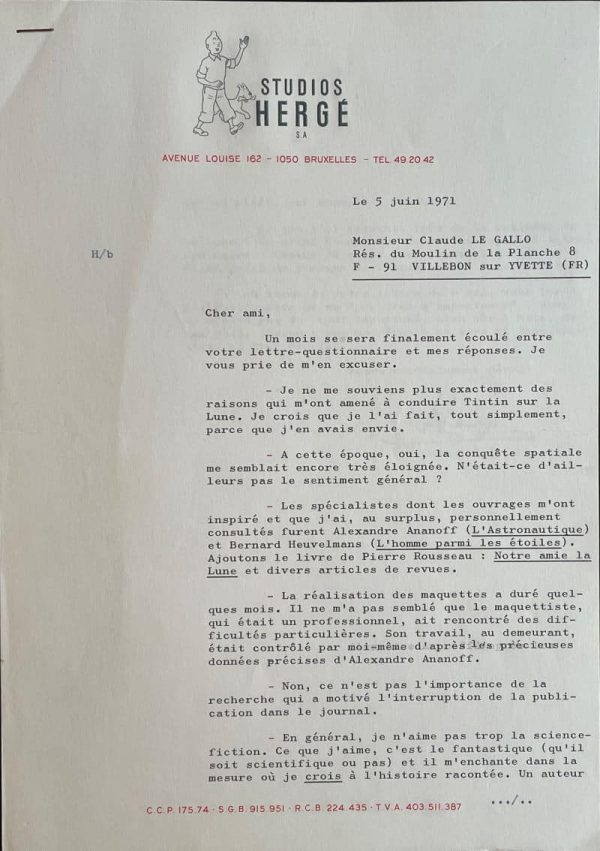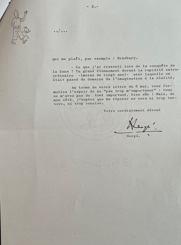 Superbe lettre dans laquelle Hergé répond à un questionnaire envoyé par Claude Le Gallo sur ce qui a été à la source de l’inspiration et la réalisation du mythique album de Tintin sur la Lune : « (…) Je ne me souviens plus exactement des raisons qui m’ont amené à conduire Tintin sur la Lune. Je crois que je l’ai fait, tout simplement, parce que j’en avais envie. – A cette époque, oui, la conquête spatiale me semblait encore très éloignée. N’était-ce d’ailleurs pas le sentiment général ? – Les spécialistes dont les ouvrages m’ont inspiré, et que j’ai, au surplus, personnellement consultés furent Alexandre Ananoff (L’Astronautique) et Bernard Heuvelmans (L’homme parmi les étoiles). Ajoutons le livre de Pierre Rousseau : Notre amie la Lune et divers articles de revues. – La réalisation des maquettes a duré quelques mois. Il ne m’a pas semblé que le maquettiste, qui était un professionnel, ait rencontré des difficultés particulières. Son travail, au demeurant, était contrôlé par moi-même d’après les précieuses données précises d’Alexandre Ananoff. – Non, ce n’est pas l’importance de la recherche qui a motivé l’interruption de la publication dans le journal. – En général, je n’aime pas trop la science-fiction. Ce que j’aime, c’est le fantastique (qu’il soit scientifique ou pas) et il m’enchante dans la mesure où je crois à l’histoire racontée. Un auteur qui me plaît, par exemple : Bradbury. – Ce qui j’ai ressenti lors de la conquête de la Lune ? Un grand étonnement devant la rapidité extraordinaire – (moins de vingt ans) – avec laquelle on était passé du domaine de l’imagination à la réalité (…) »