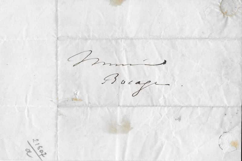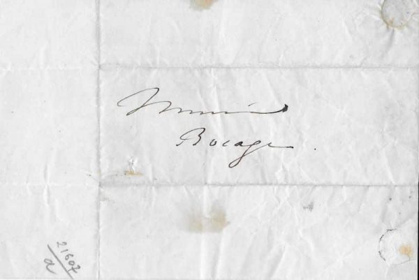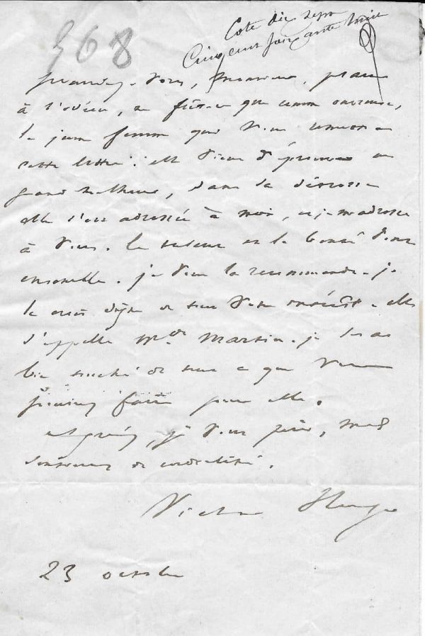Lettre de recommandation en faveur de Mme Martin pour un emploi au théâtre. Hugo, comme souvent, se sert de sa notoriété pour aider : « prendrez-vous, Monsieur, (…) la jeune femme qui vient m’adresser cette lettre : elle vient d’éprouver un grand malheur, dans sa détresse elle s’est adressée à moi, et je m’adresse à vous. Le talent et la bonté vont ensemble. Je viens la recommander (…) elle s’appelle Mde Martin. Je serai bien touché de tout ce que vous pensez faire pour elle… »