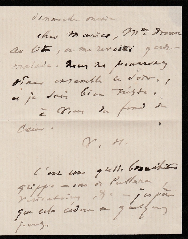 Hugo décommande une invitation pour rester auprès de Juliette Drouet malade : « Cher Meurice, Mme Drouet est au lit, et me revoici garde-malade. Nous ne pourrons dîner ensemble ce soir, et je suis bien triste. à vous du fond du cœur. C’est une grosse bronchite ou grippe (…) J’espère que cela cédera en quelques jours. »