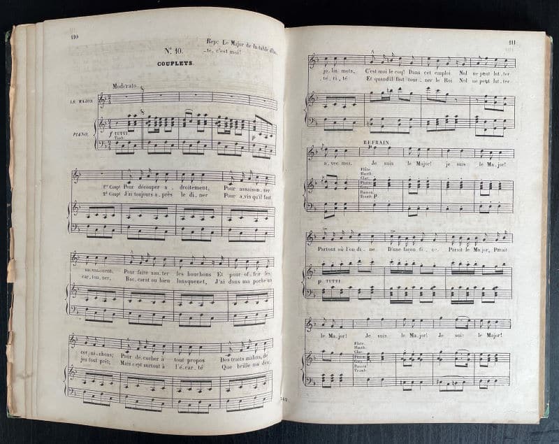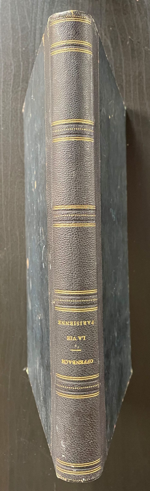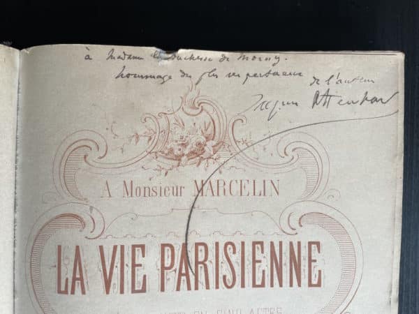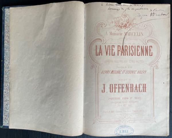 Recueil, couverture cartonné marbrée bleue nuit, comportant l’intégralité de la partition de l’opéra – bouffe en cinq actes de la Vie parisienne sur des paroles de Messieurs Henri Meilhac et Ludovic Halevy et une musique de Jacques Offenbach.