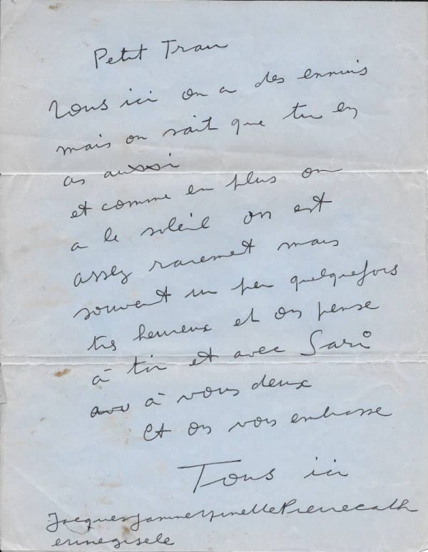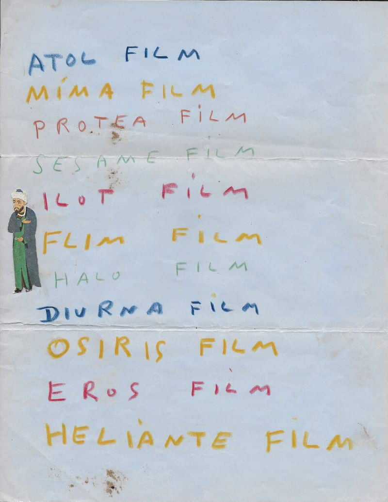 Jolie lettre amicale où l’on retrouve dans les mots la poésie de Prévert à son ami Alexandre Trauner illustre décorateur des Enfants du Paradis. Histoire d’une amitié unique du cinéma du début du XXe siècle qui lia Prévert à Trauner de 1932 à 1976 : « Petit Trau Nous ici on a des ennuis mais on sait que tu en as aussi et comme en plus on a le soleil on est assez rarement mais souvent un peu quelquefois très heureux et on pense à toi et avec Sari à vous deux et on vous embrasse Tous ici JacquesJanineMichellePierreCatherineGisèle. [Janine l’épouse de Jacques, Michelle sa fille, son frère, sa nièce et sa belle-sœur] » Sur le deuxième feuillet de papier bleu illustré d’un collage représentant un personnage persan portant turban et jellâba, Prévert a listé une série de noms de sociétés de production cinématographiques aux crayons de couleur : « Atol Film Mima Film Protea Film Sesame Film Ilot Film Flim Fim Hao Film Diurna Film Osiris Film Eros Film Heliante Film »