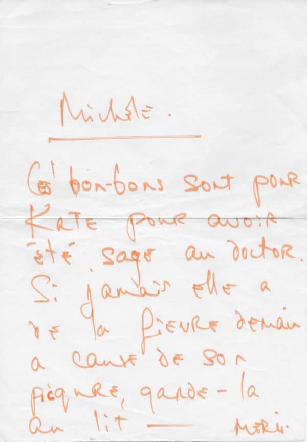 Recommandation de Jane Birkin à l’intention de la nurse de Kate et Charlotte : « Michele. Ces bonbons sont pour KATE pour avoir été sage au doctor. Si jamais elle a de la fievre demain a cause de son piqure, arde – la au lit – merci »