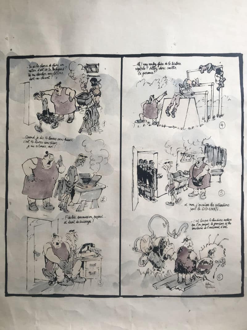 Cette œuvre est une collaboration entre le caricaturiste Jean Cabu et le peintre Claude Lepoitevin, qui fut peintre/teinturier pour l’atelier Dupuis. Planche signée par les deux artistes en bas à droite.