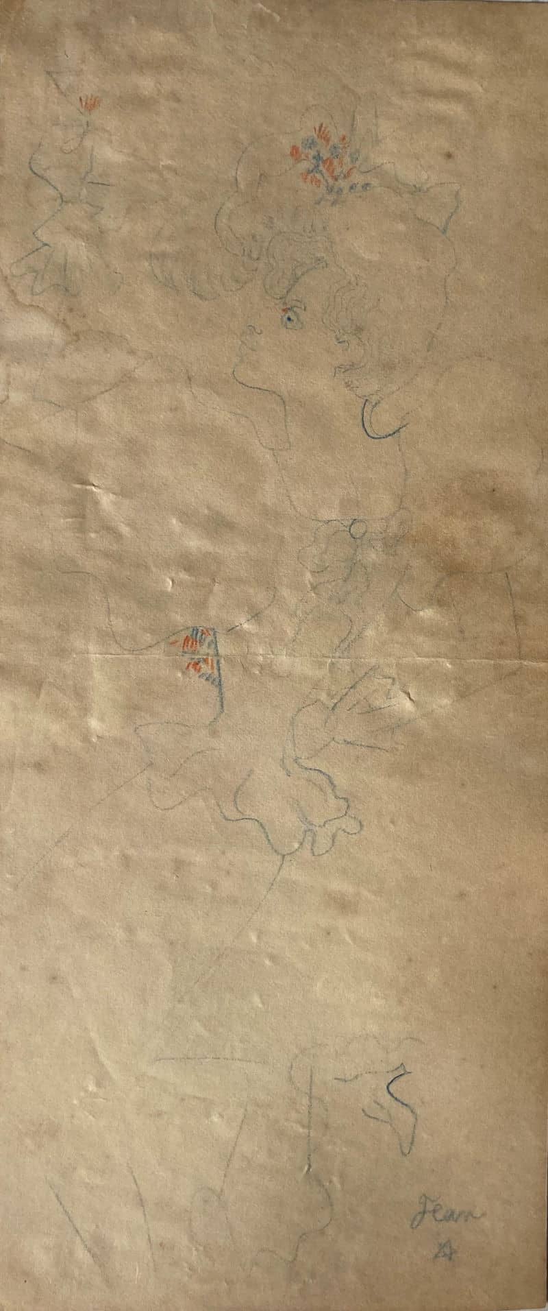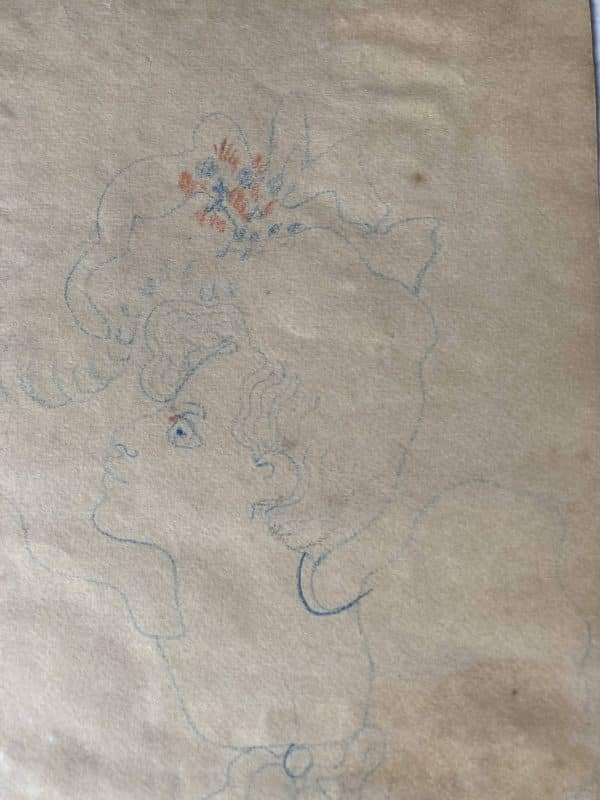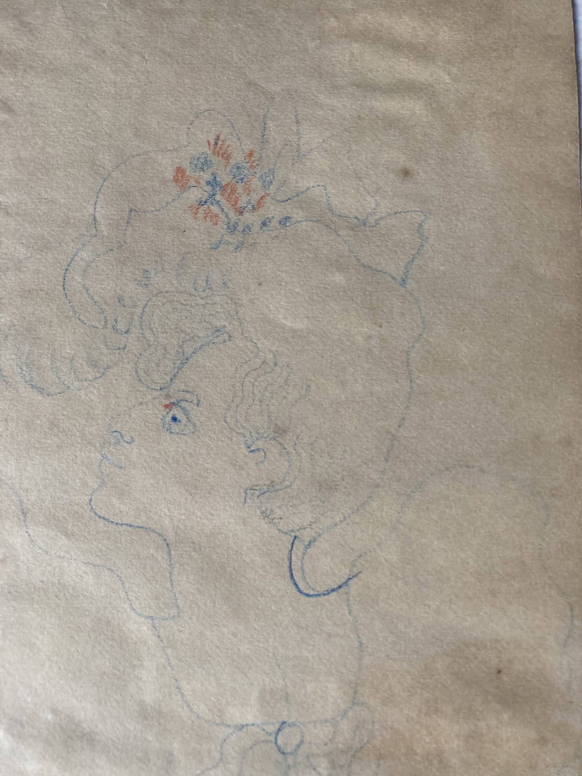 Dessin original aux crayons bleus et rouges sur papier chamois, 49×21 cm. Signé en bas à droite.