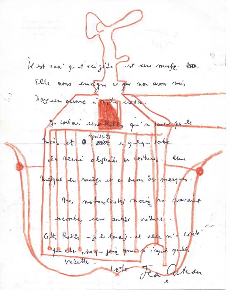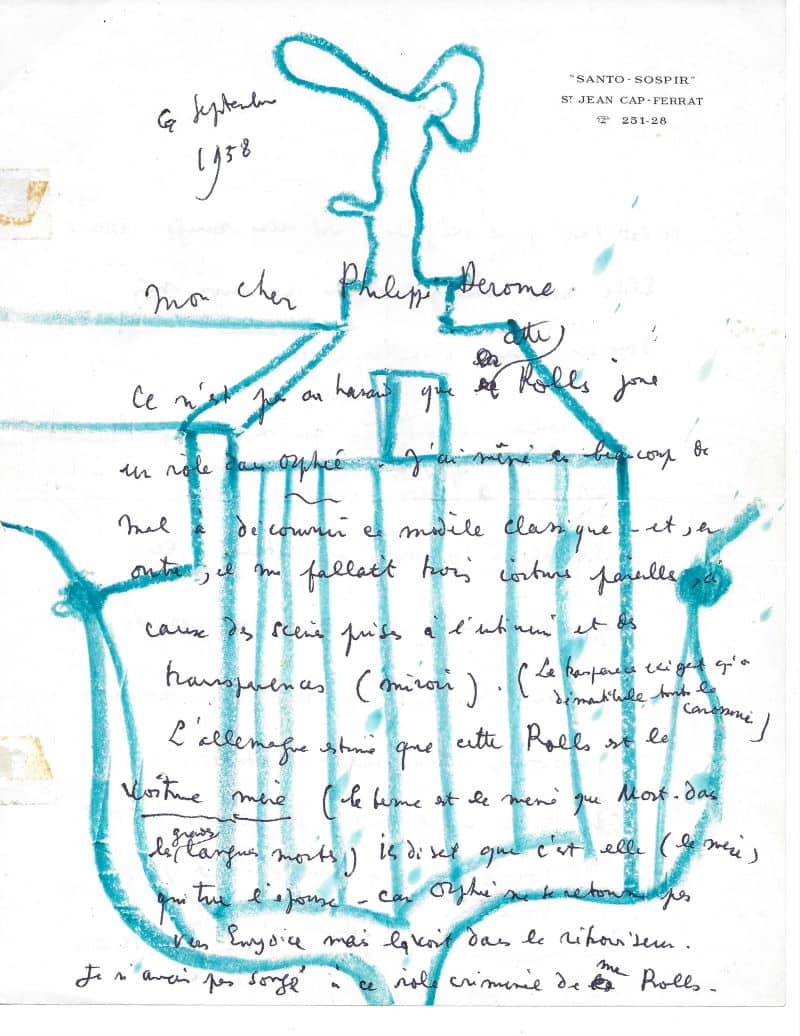 Belle lettre à propos de la location d’une Rolls pour les besoins du film Orphée. Cocteau a illustré sa lettre, au recto et verso, de deux dessins représentant la calandre ornée du célèbre « Spirit of Ectasy » tracée au crayon de couleur bleu et orange : « (…) Ce n’est pas un hasard que cette Rolls joue un rôle dans Orphée. J’ai même eu beaucoup de mal à découvrir ce modèle classique – et, en outre, il me fallait trois voitures pareilles à cause des scènes prises à l’intérieur et des transparences (miroir). (La transparence exigeant qu’on démantibule toute la carrosserie). L’Allemagne estime que cette Rolls est la voiture mère (le terme est le même que Mort-dac les grandes langues mortes). Ils disent que c’est elle (la mère) qui tue l’époux – car Orphée ne se tourne pas vers Eurydice mais le voit dans le rétroviseur. Je n’avais pas songé à ce rôle criminel de ma Rolls. Il est vrai que l’exégèse est une muse. Elle nous enseigne ce que nous avons mis dans une œuvre à notre insu. Je voulais une Rolls qui ne suit pas les modes et représente en quelque sorte la reine abstraite des voitures. Une marque en marge et au dessus des marques. Mes motocyclistes noirs ne pouvaient escorter une autre voiture. Cette Rolls – je la louait – et elle m’a coûté plus cher chaque jour que n’importe quelle vedette (…) »