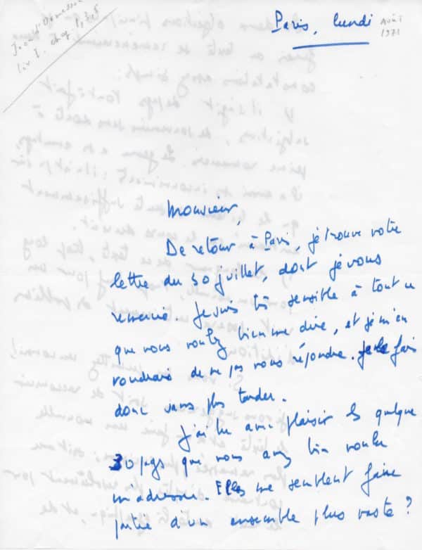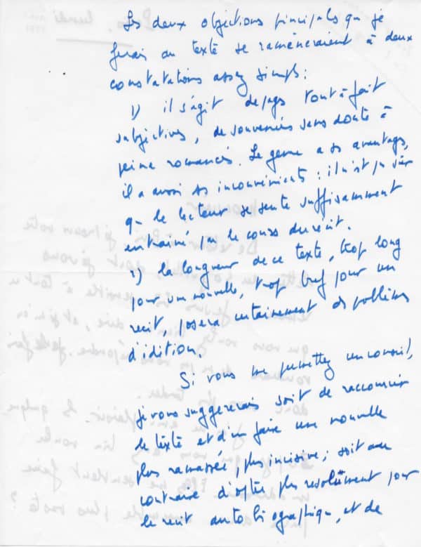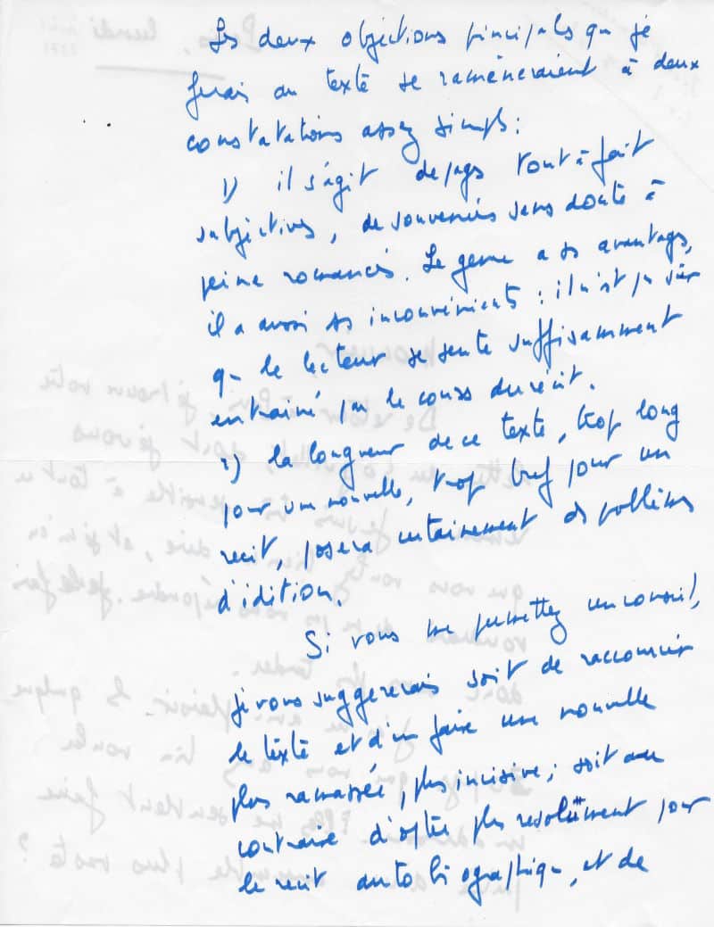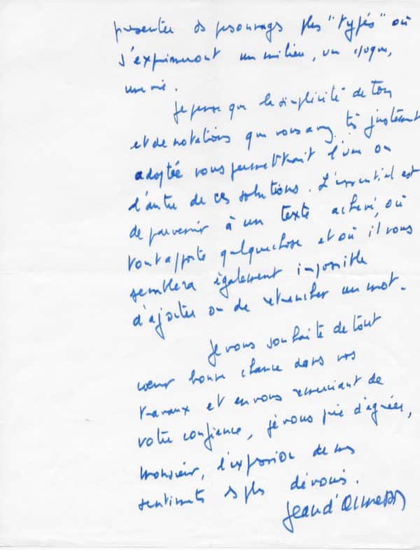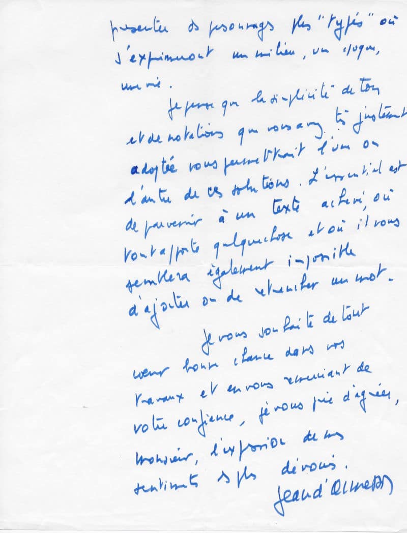 Belle lettre de conseils rédactionnels à un jeune écrivain. Cette année-là Jean d’Ormesson connait son premier grand succès littéraire avec « La gloire et l’empire », sorti le 29 septembre pour lequel lui est remis le grand prix du roman de l’Académie française : « De retour à Paris, je trouve votre lettre du 30 juillet, dont je vous remercie. Je suis très sensible à tout ce que vous voulez bien me dire, et je m’en voudrais de ne pas répondre. Je fais sans plus tarder. J’ai lu avec plaisir les quelques 30 pages que vous avez bien voulu m’adresser. Elles me semblent faire partie d’un ensemble plus vaste ? Les deux objections principales que je ferais au texte se ramèneraient à deux constatations assez simples : 1/ il s’agit de pages tout à fait subjectives, de souvenirs sans doute à peine romancés. Le genre a ses avantages, il a aussi ses inconvénients : il n’est pas sûr que le lecteur se sente suffisamment entrainé par le cours du récit. 2/ la longueur de ce texte, trop long pour une nouvelle, trop bref pour un récit, posera certainement des problèmes d’édition. Si vous me permettez un avis ! Je vous suggérerais soit de raccourcir le texte et d’en faire une nouvelle plus ramassée, plus incisive ; soit au contraire d’opter plus résolument pour le récit autobiographique, et de présenter des personnages plus « typés » où s’exprimeront un milieu, une époque, une vie. Je pense que la simplicité de ton et de notations que vous avez très justement adoptée vous permettrait l’une ou l’autre de ces solutions. L’essentiel est de parvenir à un texte achevé, où il vous semblera également impossible d’ajouter ou de retrancher un mot. Je vous souhaite de tout cœur bonne chance dans vos travaux et en vous remerciant de votre confiance (…) »