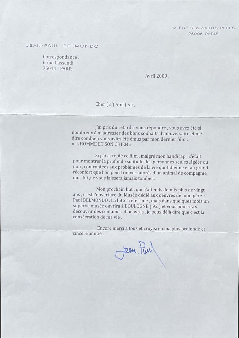 Belle lettre de Belmondo, icône du cinéma français, qui évoque pêle-mêle la sortie de son ultime film, « l’Homme et son chien », retour héroïque et inattendu au cinéma après sept ans d’absence, suite à un AVC qui l’avait terrassé le 8 août 2001, ainsi que l’édifice d’un musée dédié aux sculptures de son père : « J’ai pris du retard à vous répondre, vous avez été si nombreux à m’adresser des bons souhaits d’anniversaire et me dire combien vous aviez été émus par mon dernier film : « L’HOMME ET SON CHIEN ». Si j’ai accepté ce film, malgré mon handicap, c’était pour montrer la profonde solitude des personnes seules, âgées ou non, confrontées aux problèmes de la vie quotidienne et au grand réconfort que l’on peut trouver auprès d’un animal de compagnie qui, lui, ne vous laissera jamais tomber. Mon prochain but, que j’attends depuis plus de vingt ans, c’est l’ouverture du Musée dédié aux œuvres de mon père : Paul BELMONDO. La lutte a été rude, mais dans quelques mois un superbe musée ouvrira à BOULOGNE (92) et vous pourrez y découvrir des centaines d’œuvres, je peux déjà dire que c’est la consécration de ma vie… »
